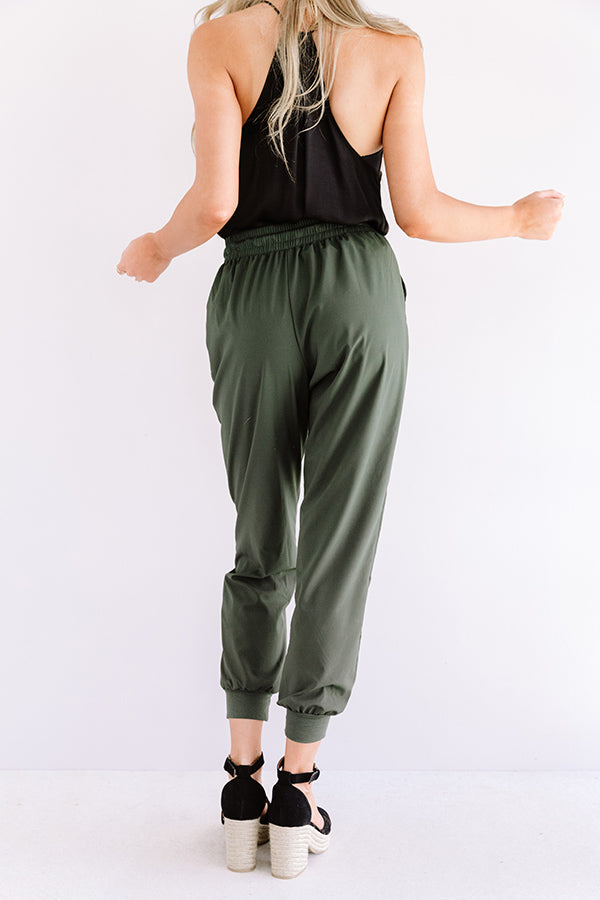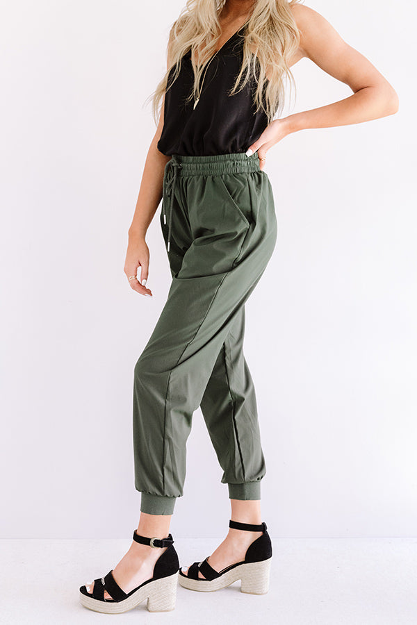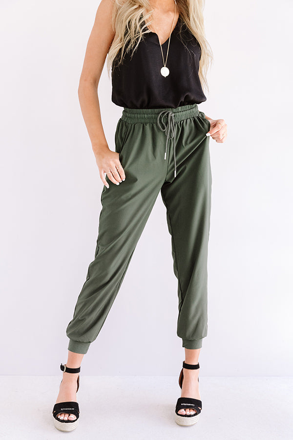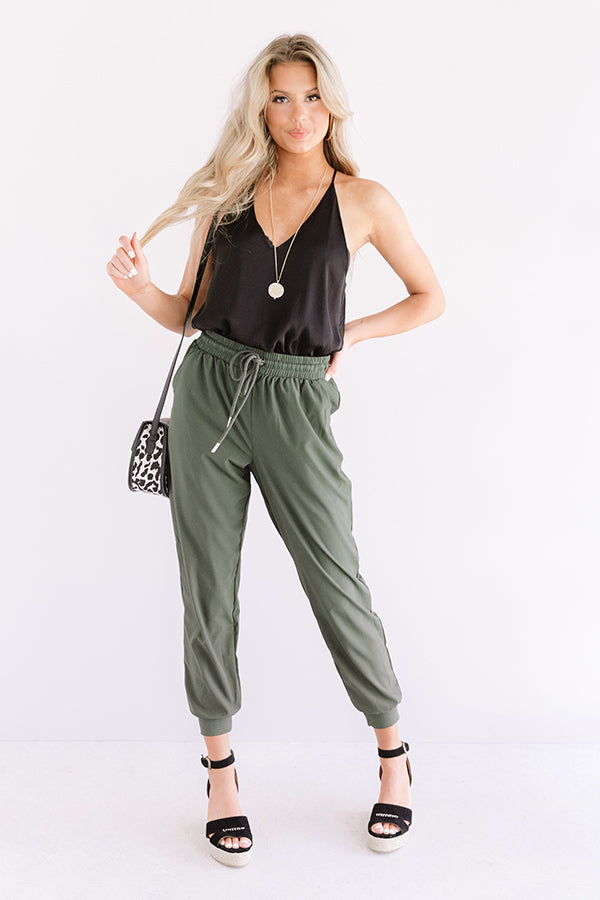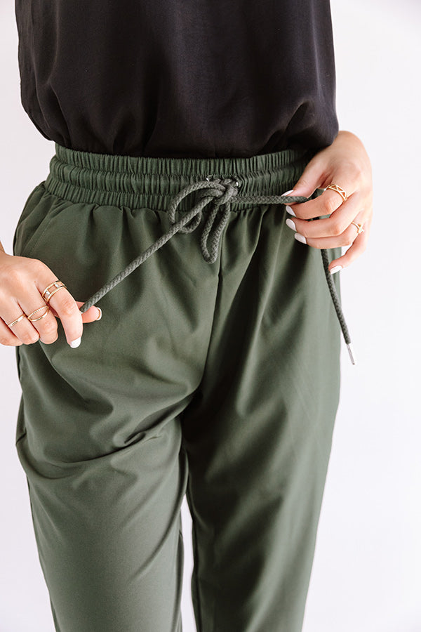 Stay chic AND cozy in our dark olive colored "Grove" joggers featuring sleek lightweight material, a high elastic waistline with a tie belt closure, accent side and back pockets, and a relaxed pants silhouette that falls into fitted ankle length hemlines! You can style these cuties with a black tank and wedge, or you can wear it with a graphic tee, sunnies, a faux leather backpack, and some matching trendy sneakers! Measurements