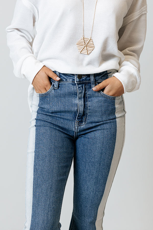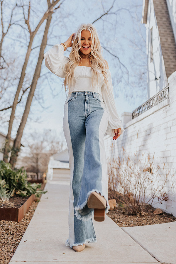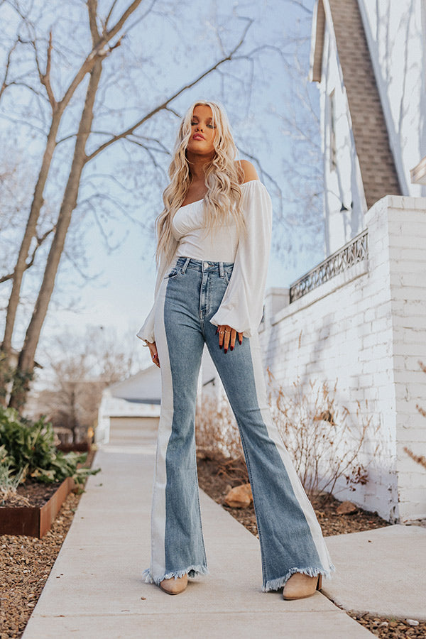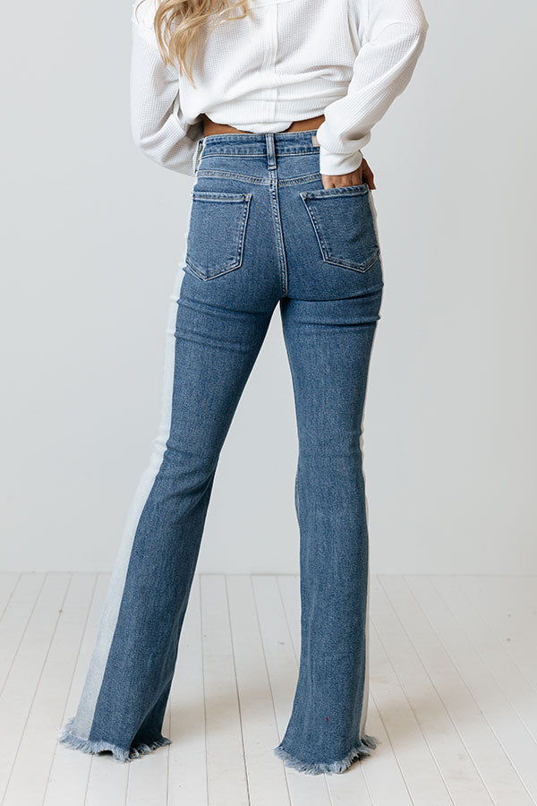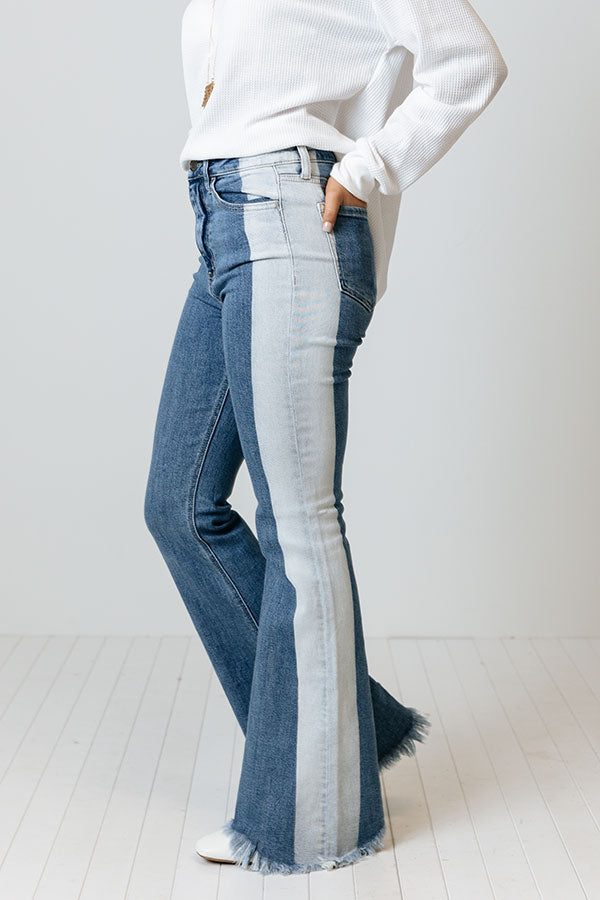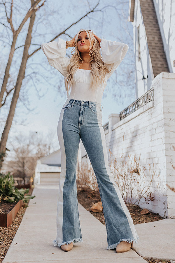 Stay unique in our trendy 'Grover' flare featuring two tone light and medium wash denim material, a high waistline with belt loops, a hidden zip fly with a button closure, a classic five pocket cut, and a flattering figure hugging silhouette that falls into flared ankle-length hemlines with frayed trim detailing! Measurements