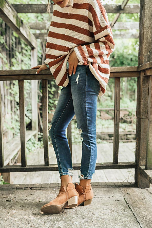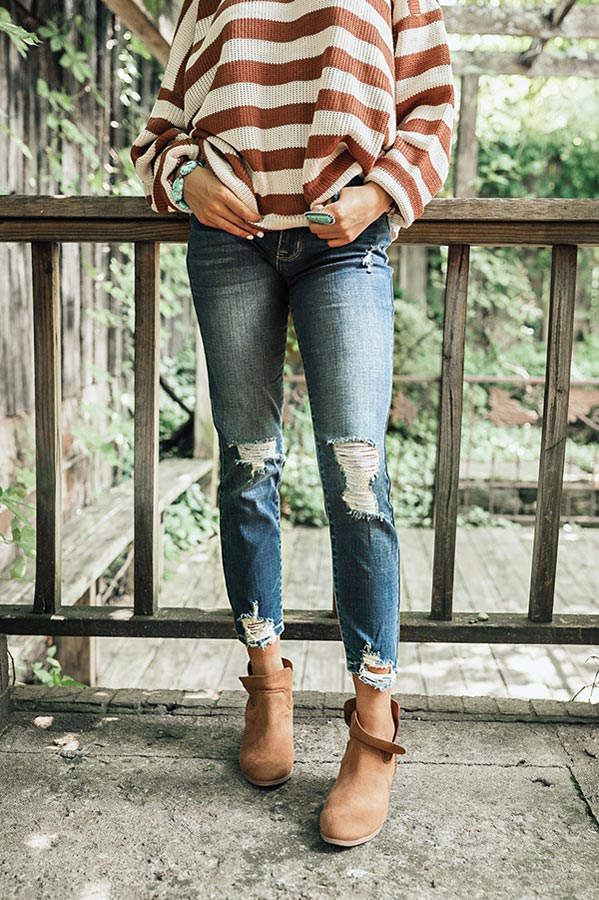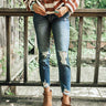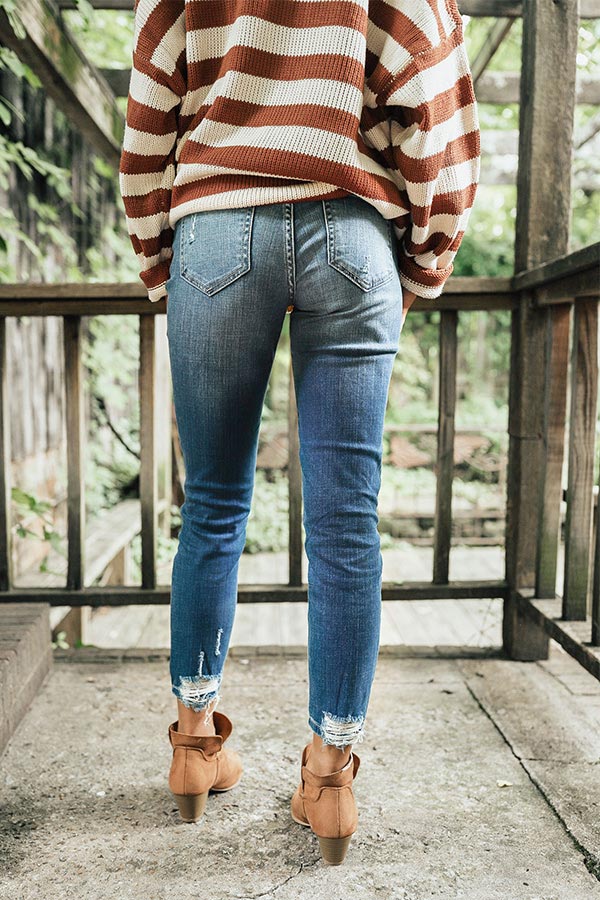These medium wash distressed skinny jeans have a mid-rise fit, a distressed skinny pant leg & a distressed ankle length hem.