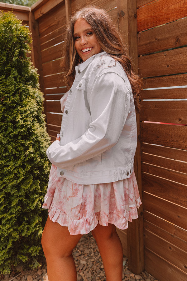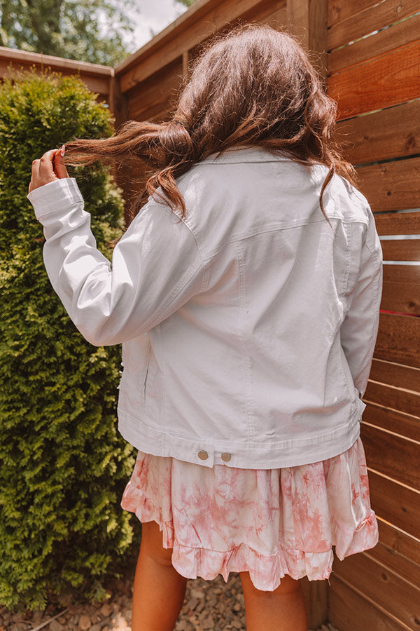 Plus Size - Layer up in style all year round with our trendy white 'Harlee' jacket featuring lightweight denim material with subtle distressed detailing, a button down front with a collared neckline, two side pockets and chest pockets with flap closure, long loose sleeves with button closure cuffs, and a relaxed silhouette that ends in a straight hemline! Measurements