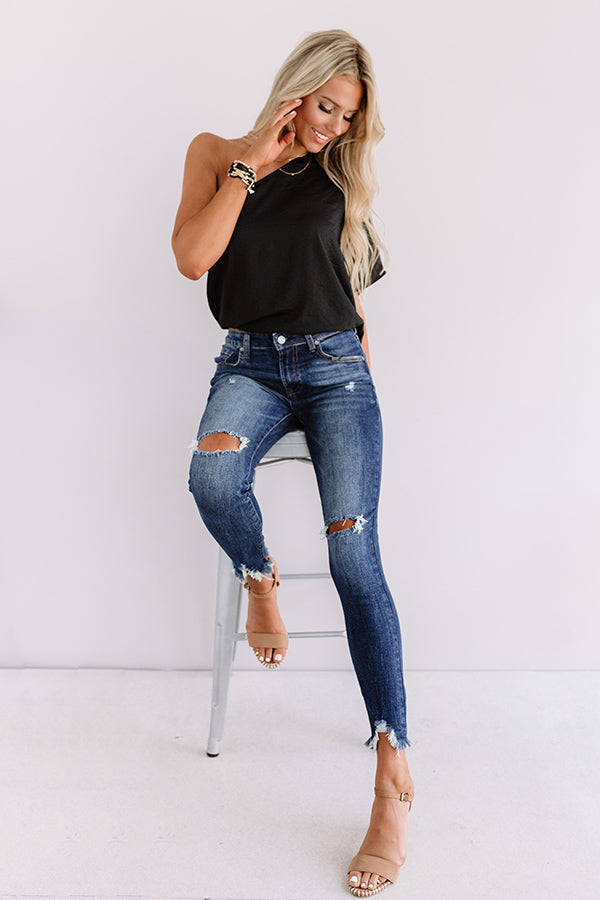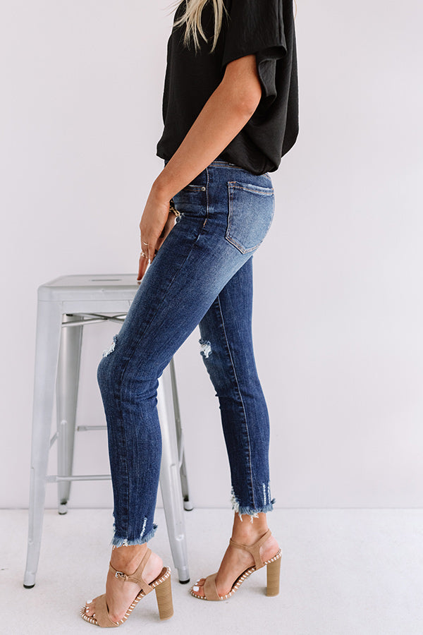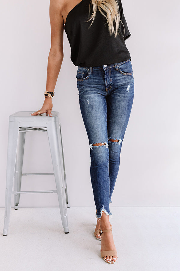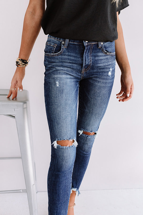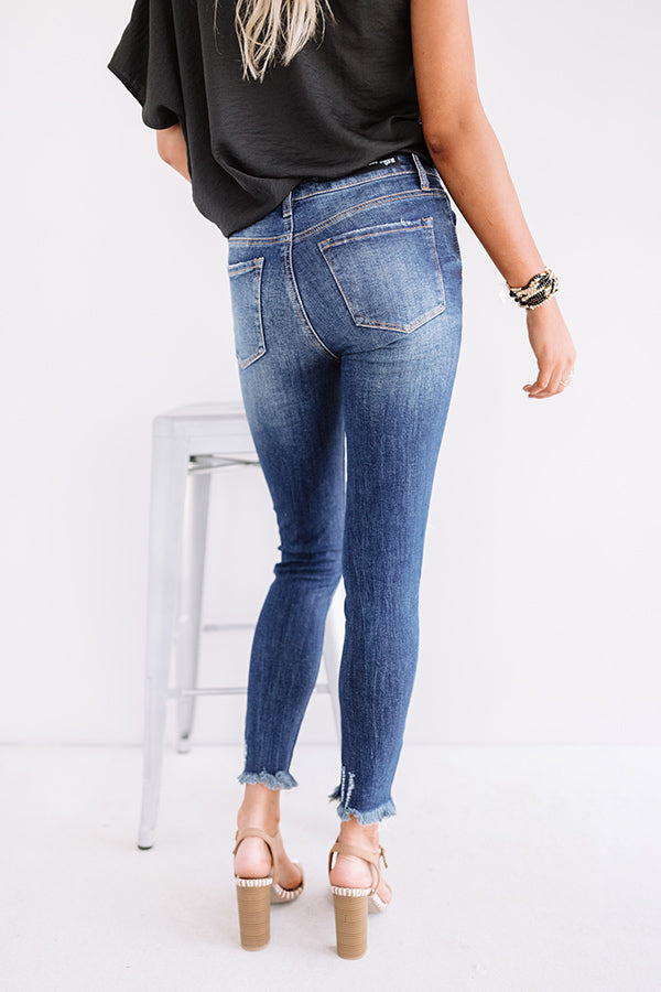 Life is more than just fitting into your jeans, but we believe you will LOVE the look and feel of our "Harlon" skinnies featuring lightweight dark wash denim material with distressed detailing and subtle accent fading, a midrise waistline with belt loops, four pocket cuts, a hidden zip fly with a button closure, and a form fitting silhouette that falls into frayed ankle-length hemlines that can be cuffed! These trendy bottoms will take you from season to season when you wear with your favorite open toed heel, sunnies, and tank top in the summer and with booties, a faux suede hat, and a sweater in the fall!