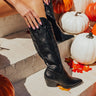Add a luxe western touch to your glam holiday wardrobe with our trendy black 'Harris' cowboy boot featuring faux leather material with accent stitching, a pointed closed toe, a 2.5-inch block heel, an inside ankle-zip closure, a 14-inch calf circumference, and a flirty knee-high silhouette! This boot runs more true to size.
