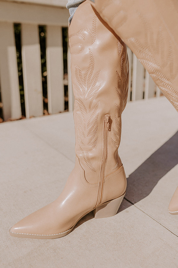 Add a luxe western touch to your glam holiday wardrobe with our trendy natural 'Harris' cowboy boot featuring faux leather material with accent stitching, a pointed closed toe, a 2.5-inch block heel, an inside ankle-zip closure, a 14-inch calf circumference, and a flirty knee-high silhouette! This boot runs more true to size.