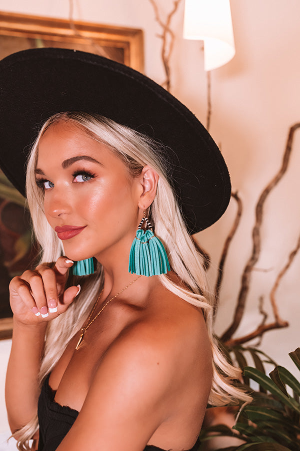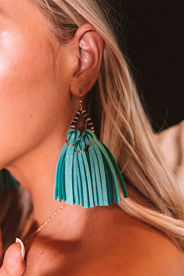 The 3-inch "Havana" earrings feature 14kt gold fill wire and seafoam colored hand cut North American genuine leather and striped agate stones in a striking fanned tassel silhouette!