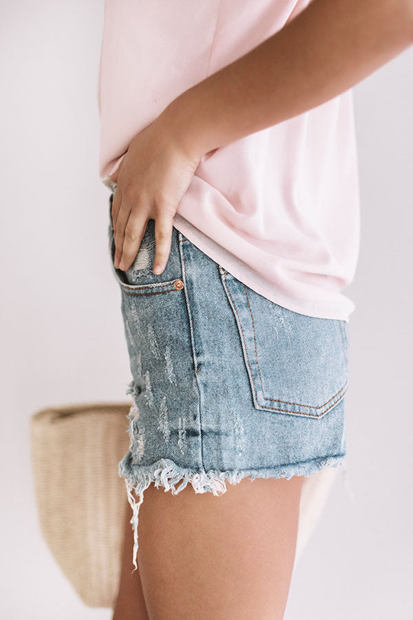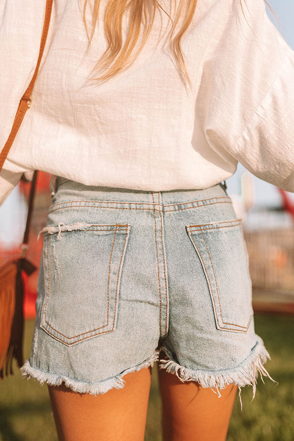 Dress to impress in these high waisted shorts that have distressed details and a light wash color! They feature a classic 5-pocket cut with belt loops, a hidden zip fly and button closure! Pair these with a classy tank and wedges for the perfect summer carnival outfit! Measurements