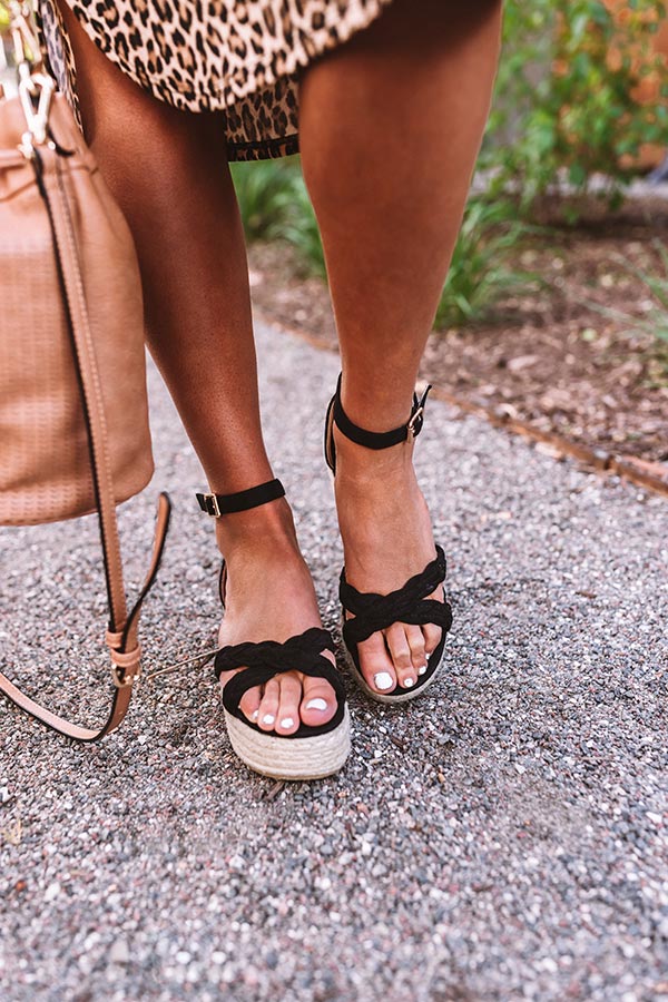 Let your wild side show with our adorable "Hollis Espadrille" featuring flat 2-inch soles with woven texturing, two black braided crossed over-the-foot straps and buckled ankle straps, and rounded open toes and closed heels!
