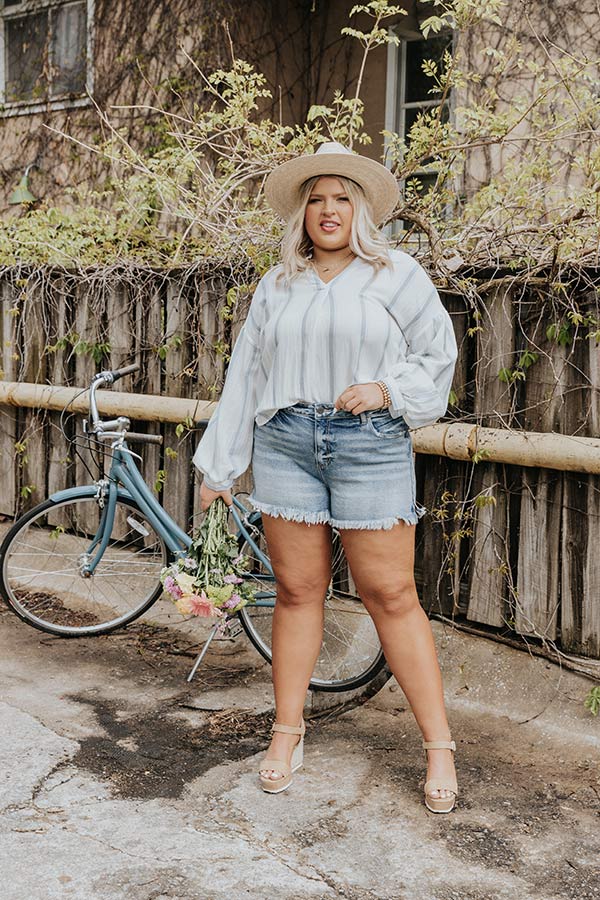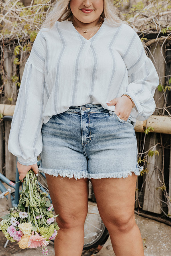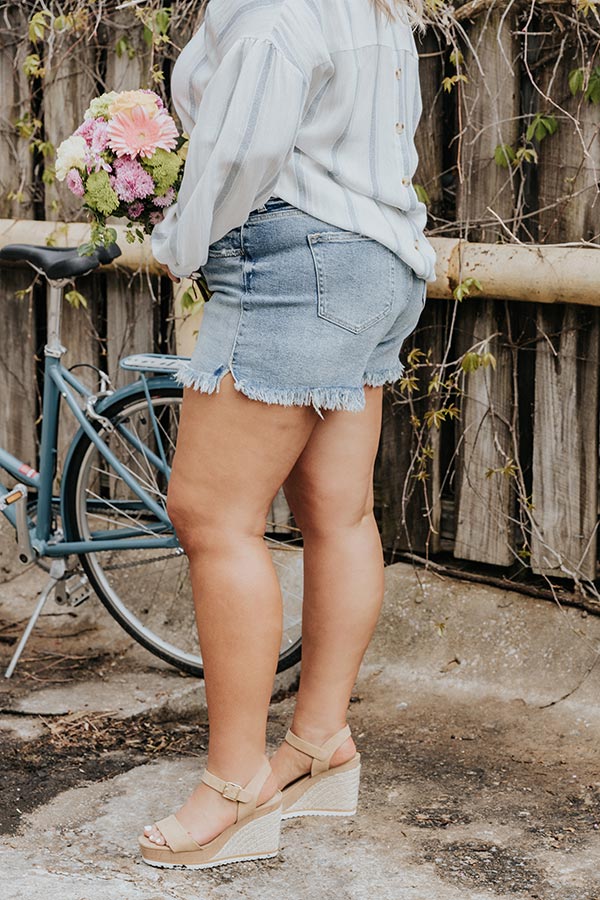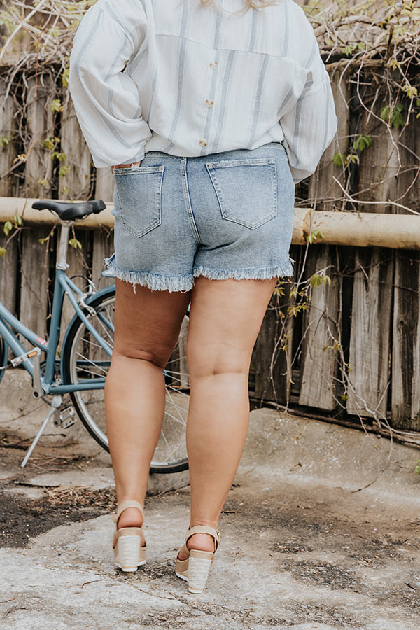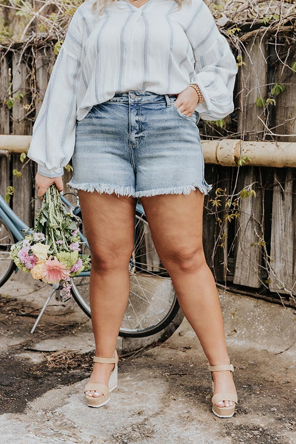Plus Size - The adorable 'Hope' shorts feature lightweight and stretchy medium wash denim material with subtle accent fading, a high waist fit with belt loops, a hidden zip fly with a button closure, a classic five pocket cut, and a flattering form fitting silhouette that ends in frayed upper-thigh length hemlines!