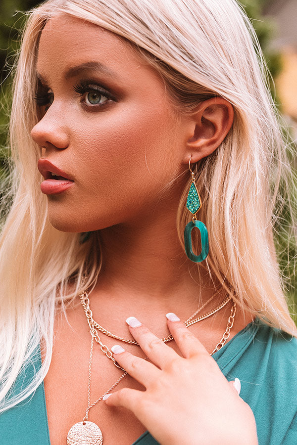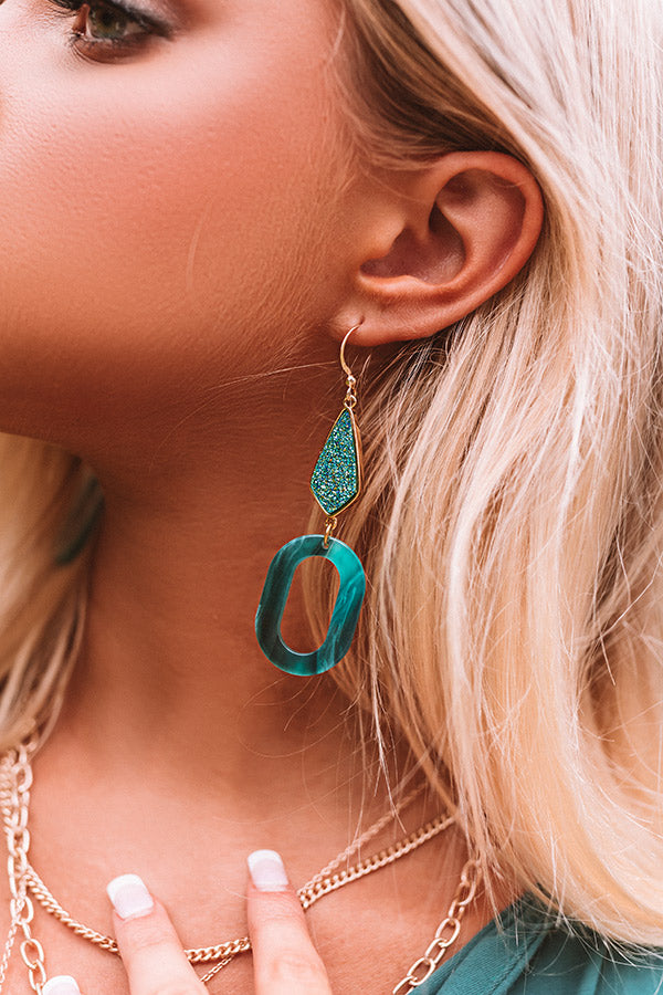 The stunning "Isabella" statement earrings feature dangling dark turquoise hued druzy stones with matching oval hoops! No two styles are the same due to variations in manufacturing.