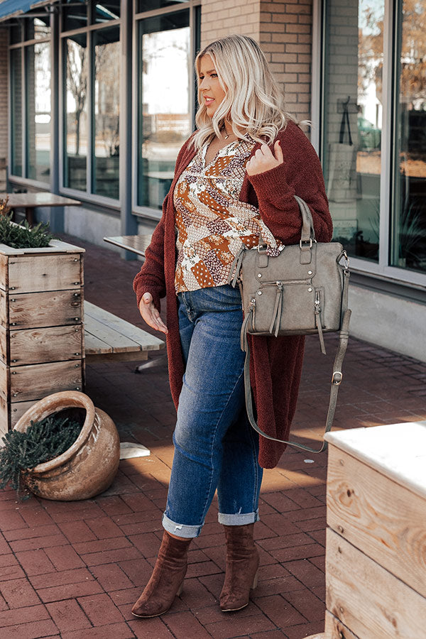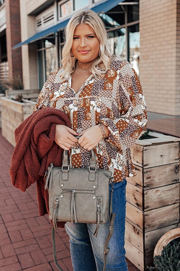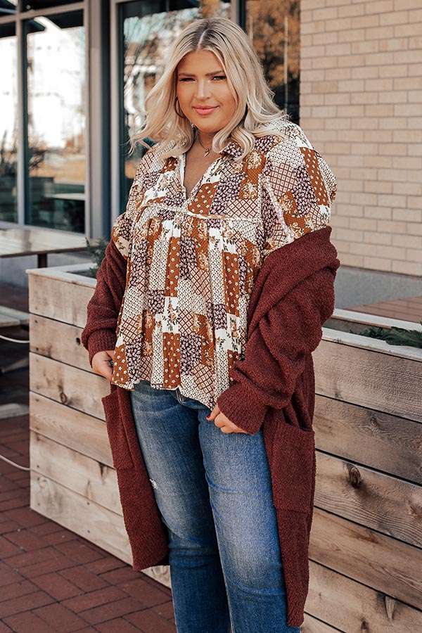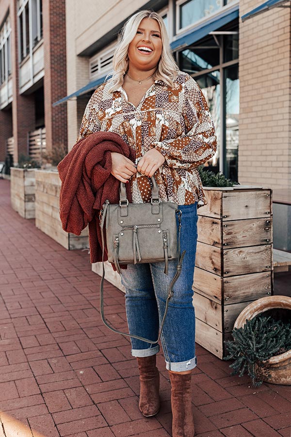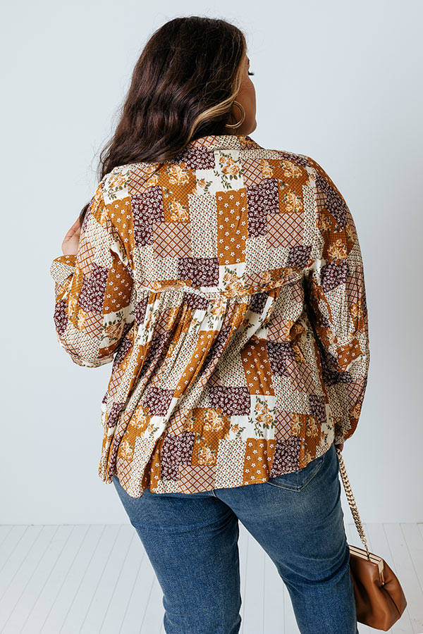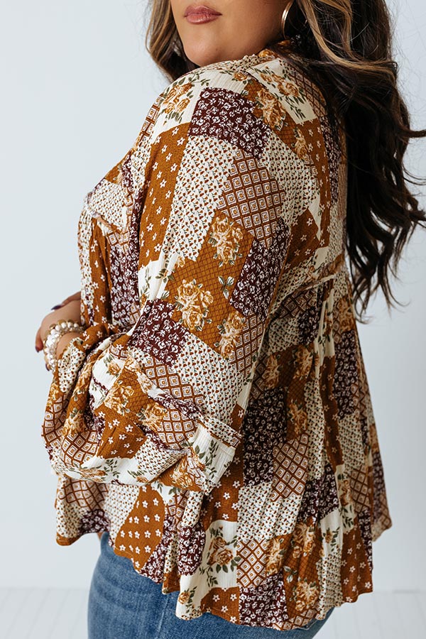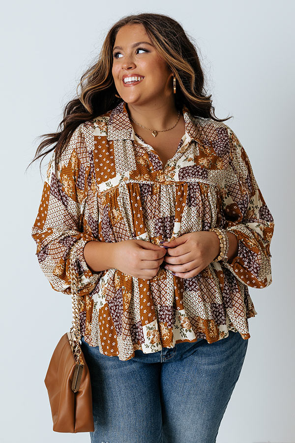 You are sure to turn heads in our beautiful plus size cream colored 'Ivee' top featuring lightweight flowy material patterned with a variety of unique rust, brown, and natural hued floral print patchwork, a v-cut neckline, long loose sleeves, and a relaxed babydoll silhouette that falls into an uneven hemline!