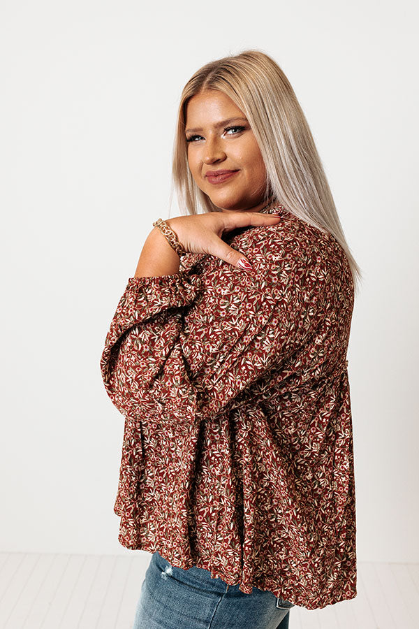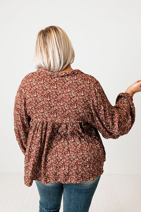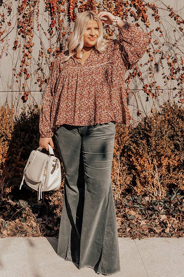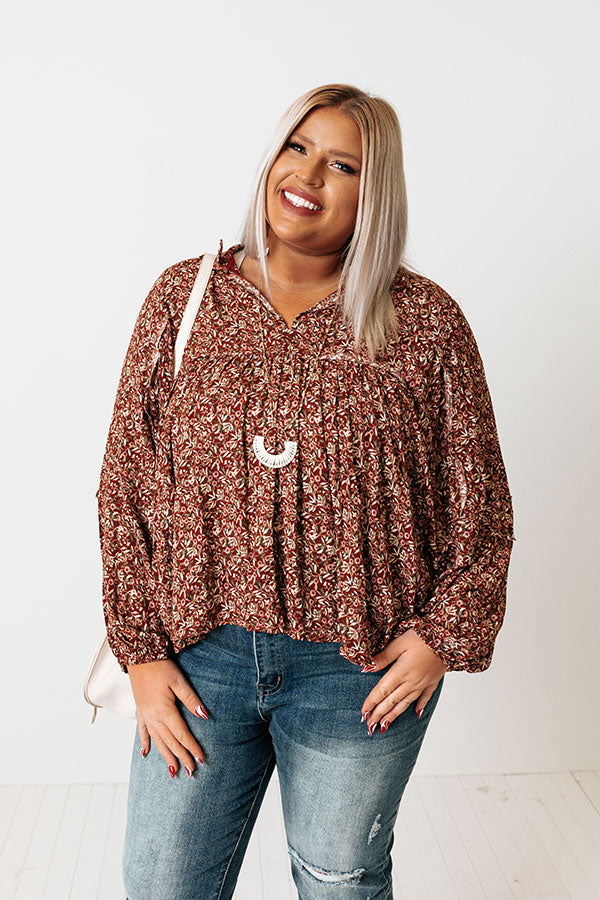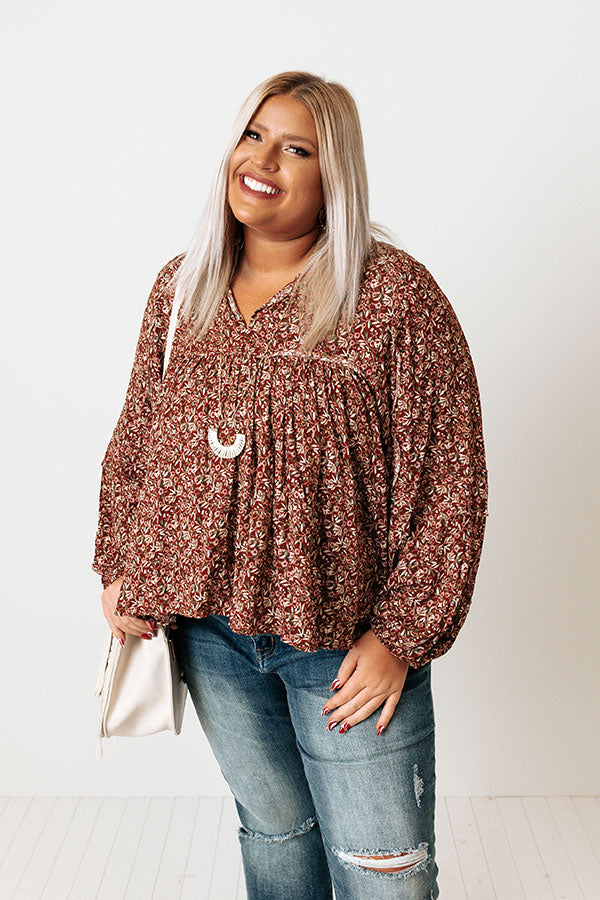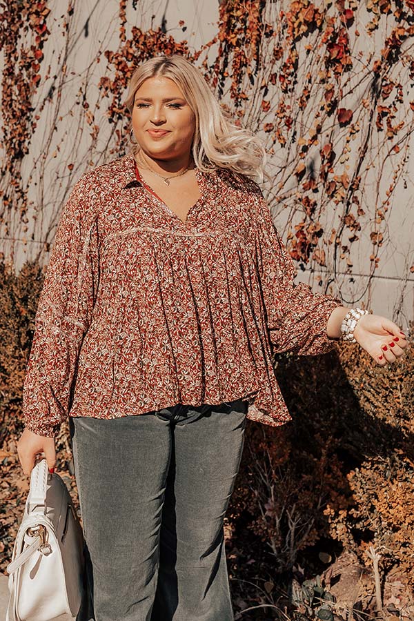 You are sure to turn heads in our beautiful plus size rust colored 'Ivee' top featuring lightweight flowy material patterned with an intricate brown and cream hued floral print, a v-cut neckline, long loose sleeves, and a relaxed babydoll silhouette that falls into an uneven hemline!