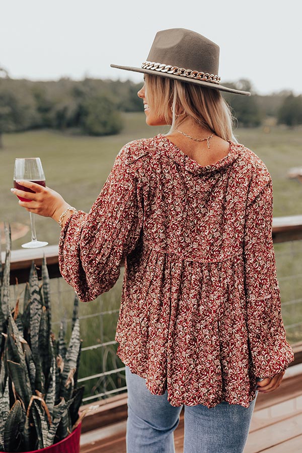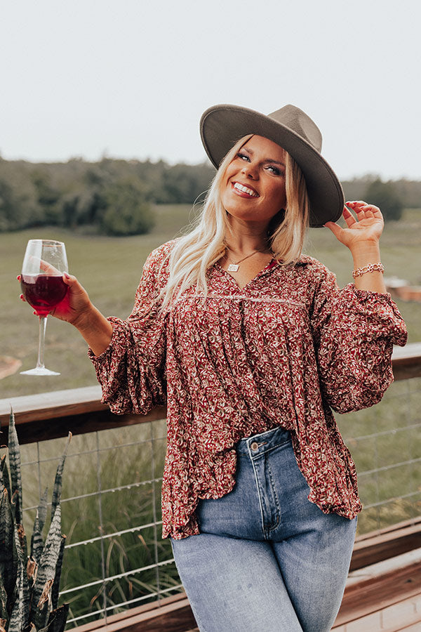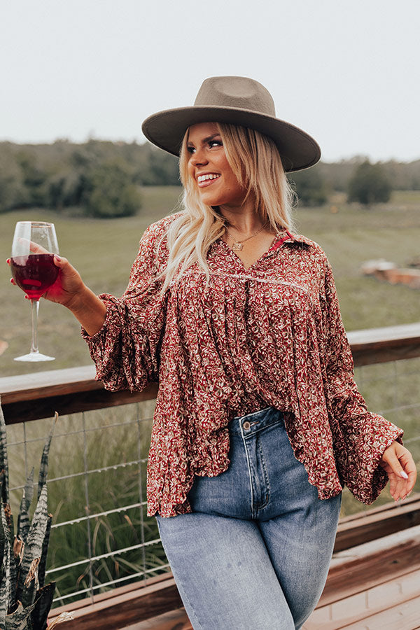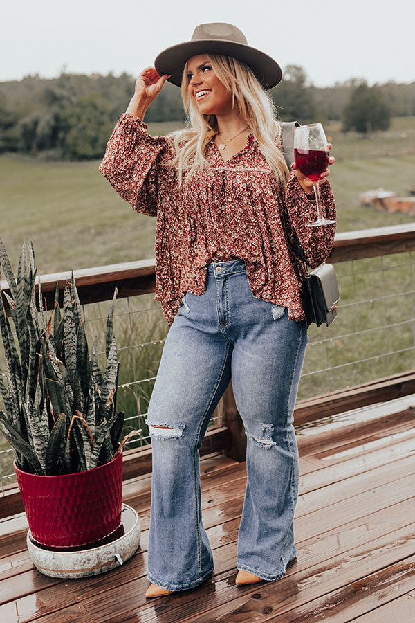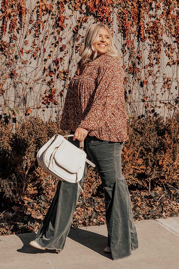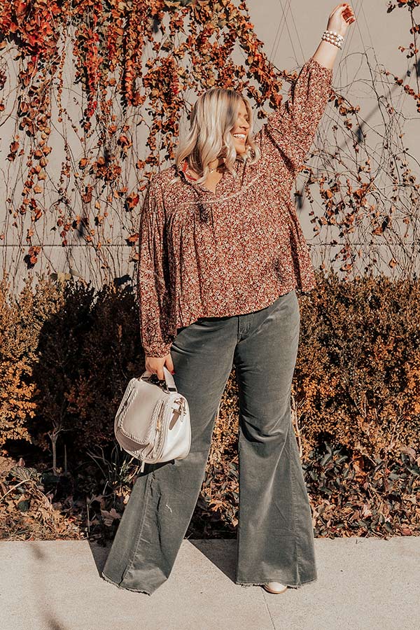 You are sure to turn heads in our beautiful plus size rust colored 'Ivee' top featuring lightweight flowy material patterned with an intricate brown and cream hued floral print, a v-cut neckline, long loose sleeves, and a relaxed babydoll silhouette that falls into an uneven hemline!