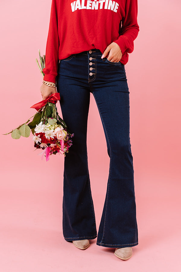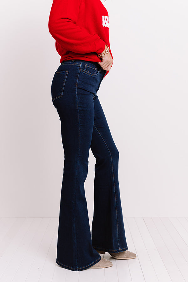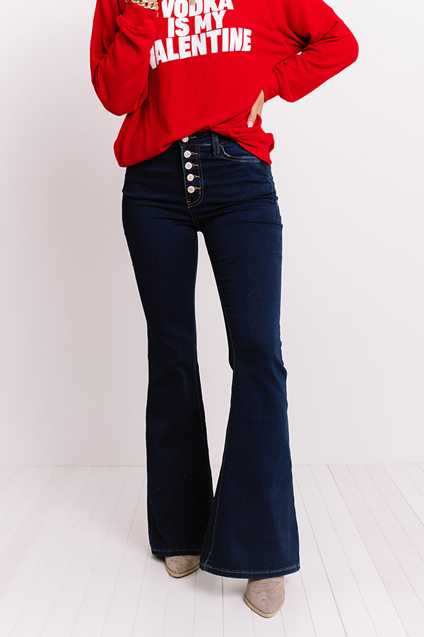 Stay groovy with our trendy 'Jackie' flares featuring lightweight stretchy dark wash material, a high waistline with belt loops, a five button closure, four pocket cuts, and a flattering form fitting silhouette that falls into oversized floor-length hemlines!