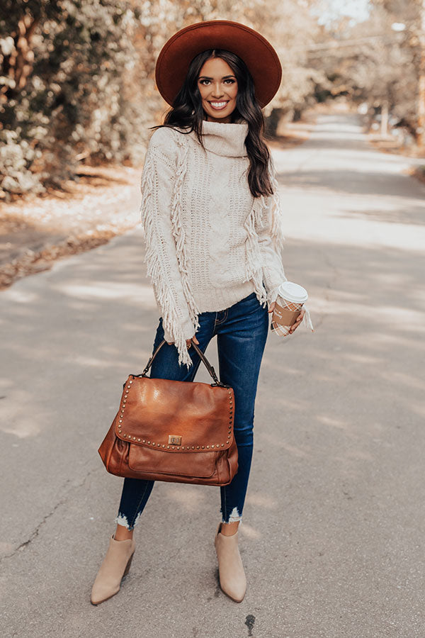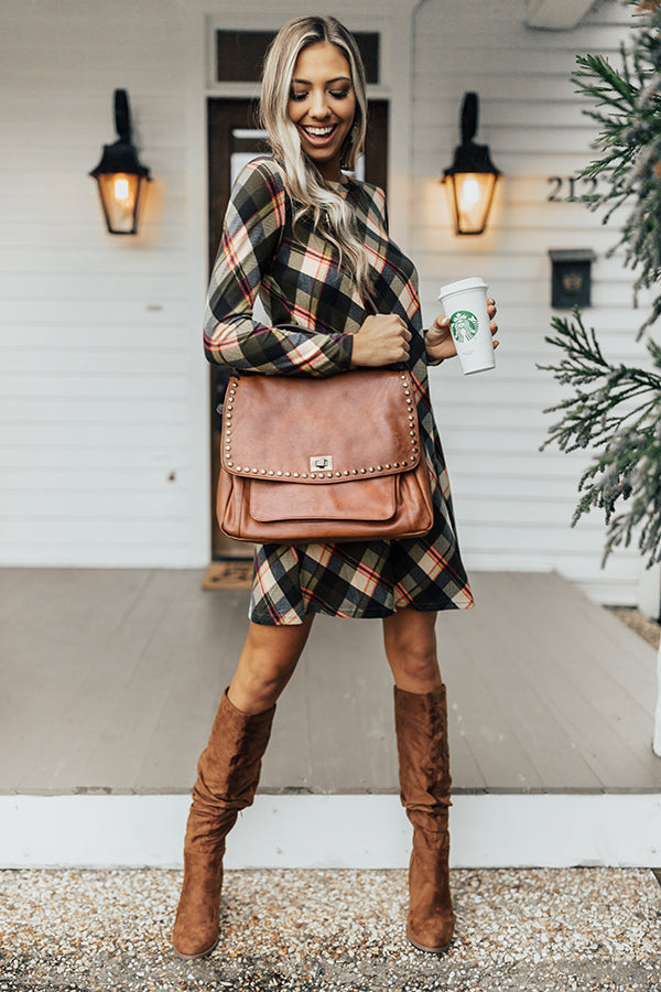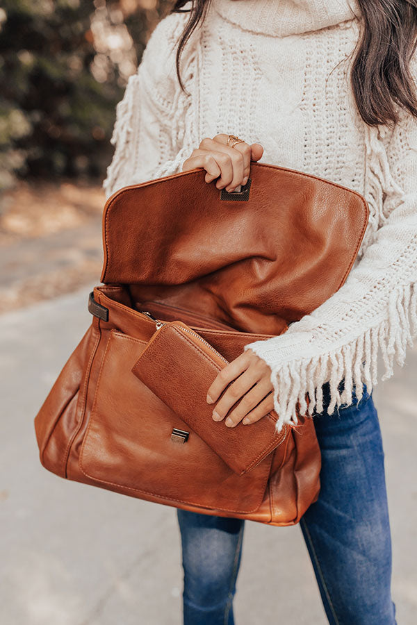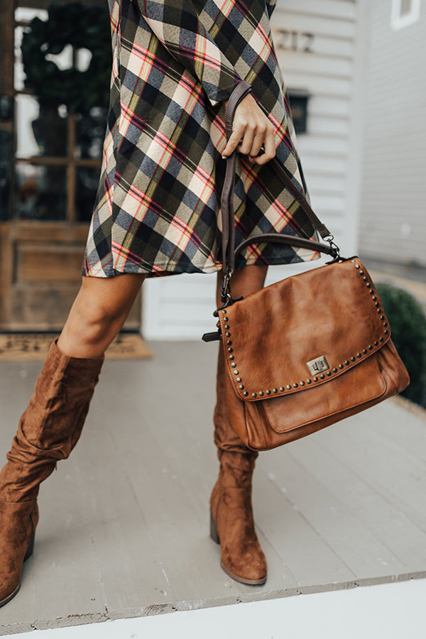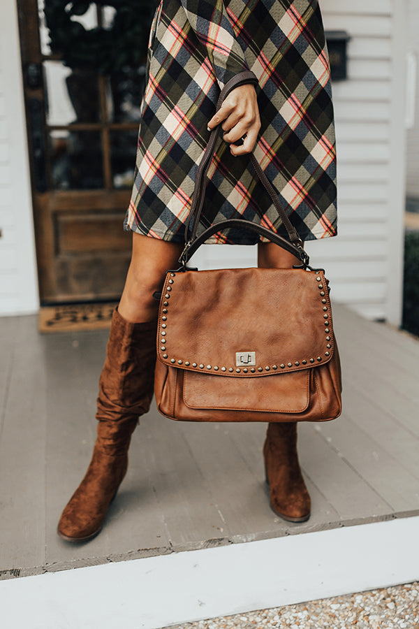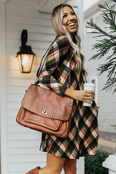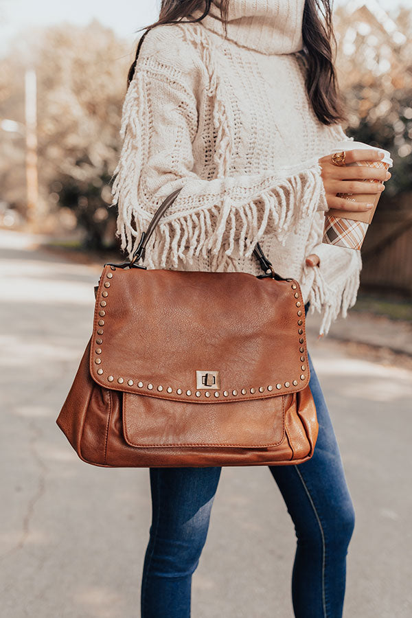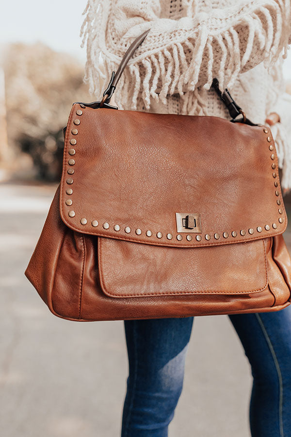 This faux leather handbag has a antique gold studded front flap with turn-lock closure that opens up & features a fully lined interior & exterior pocket.