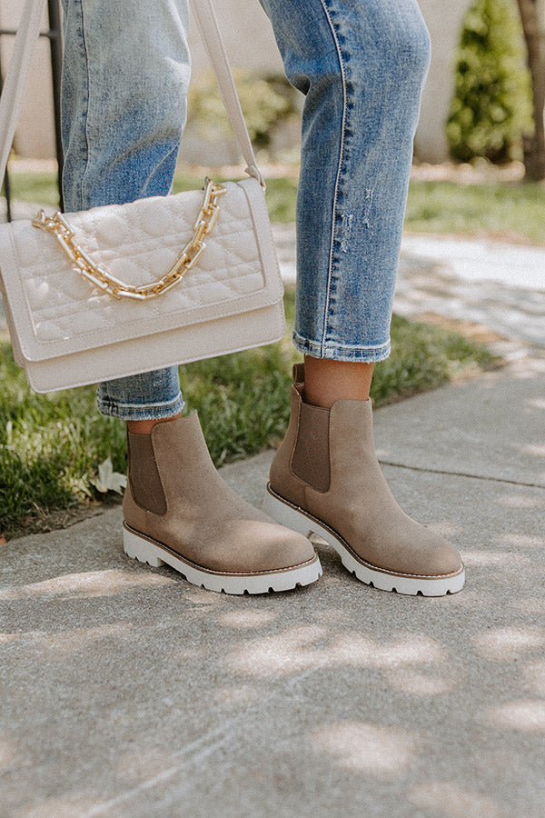 Perfect for throwing-on-and-going with, our versatile taupe colored 'Jaxon' boot features suede leather material, a rounded closed toe, a flat grip sole, and a slip-on silhouette with elastic panels on each side! This boot runs more true to size.