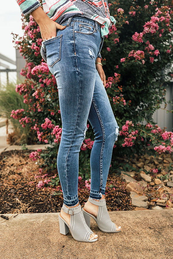 These medium wash skinny jeans have a flattering high waisted fit, subtle distressing & fading, a great stretchy fitted feel & a skinny pant leg with a raw released ankle length hem.