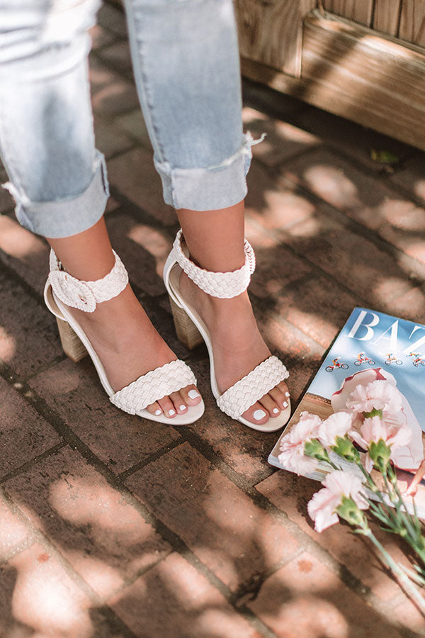If the shoe fits...strut! These natural faux suede shoes are perfect for strutting in with the 4-inch block heels, braided straps, rounded open toes, and large buckles on the outside!