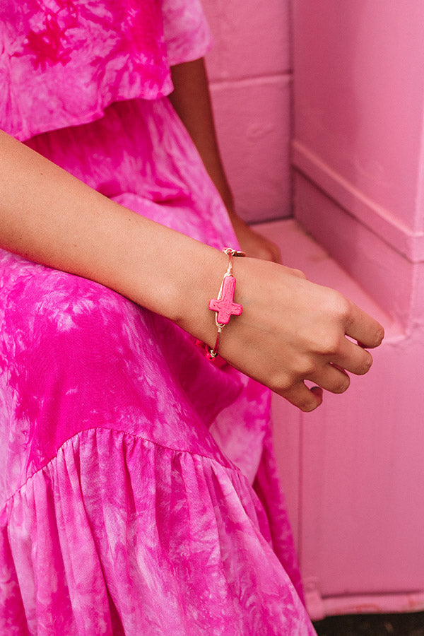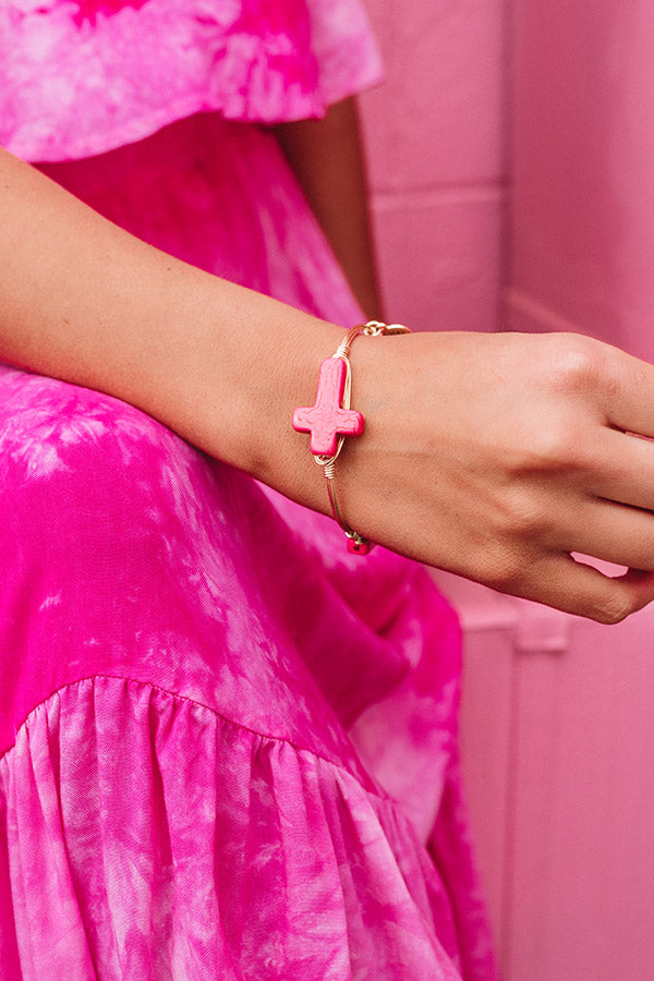 The "Jett" bracelet features a gold plated brass wire-wrapped bangle adorned with three pink crosses!