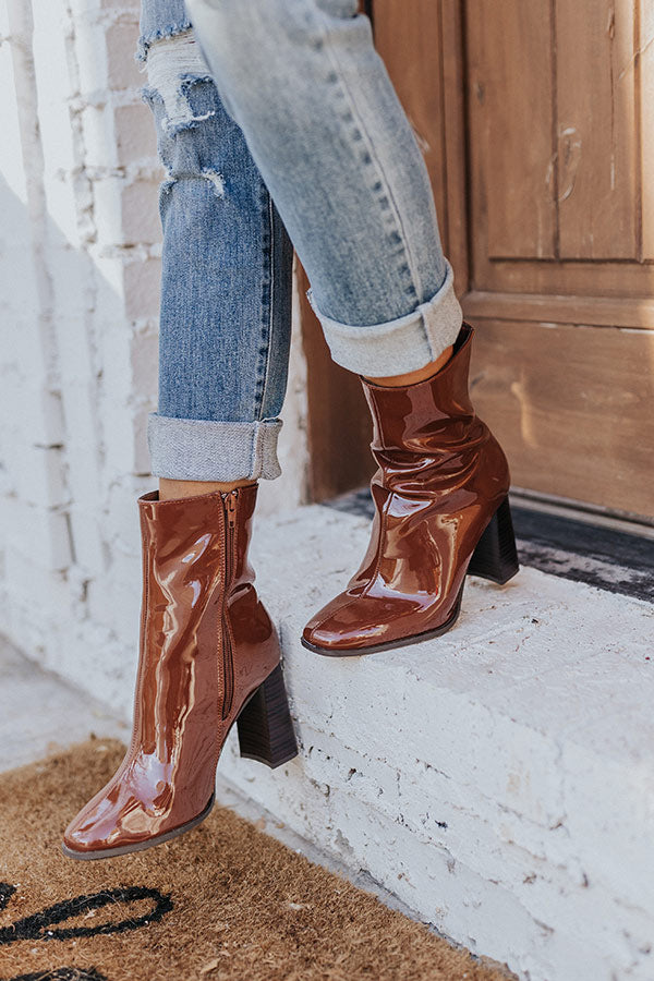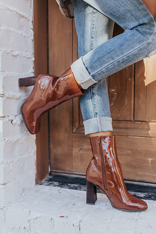 The perfect transitional shoe just dropped! Switch for season to season effortlessly in our chic brown 'Jill' bootie featuring sleek patent material, a 3.5-inch block heel height, in inside zip closure, a closed toe, and an above-the-ankle silhouette! This patent bootie runs true to size.