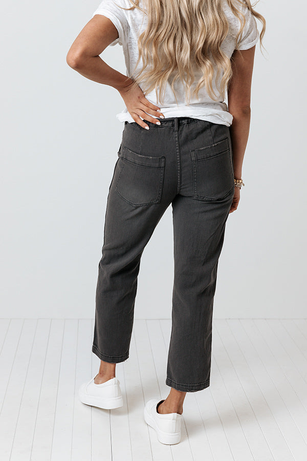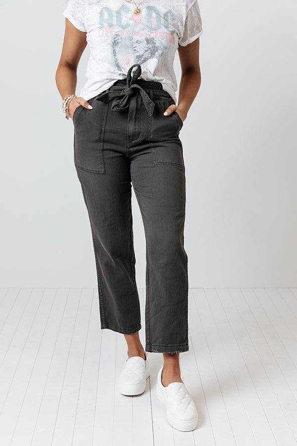 Keep your look casual but cute with our trendy charcoal colored 'Joanie' pant featuring lightweight material, a high waistline with belt loops and a tie belt, two side pockets and two back pockets, and a relaxed silhouette that falls straight into ankle-length hemlines! Measurements