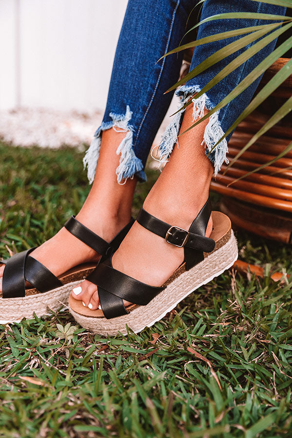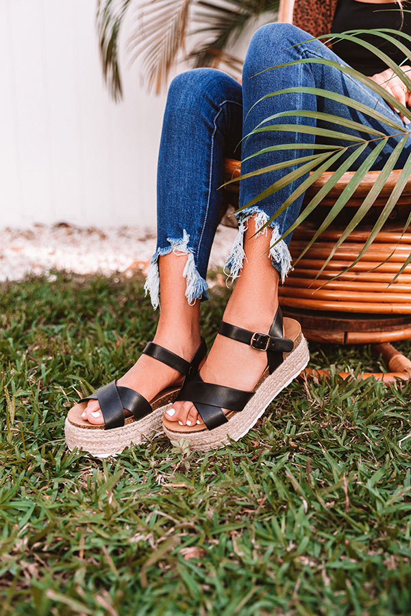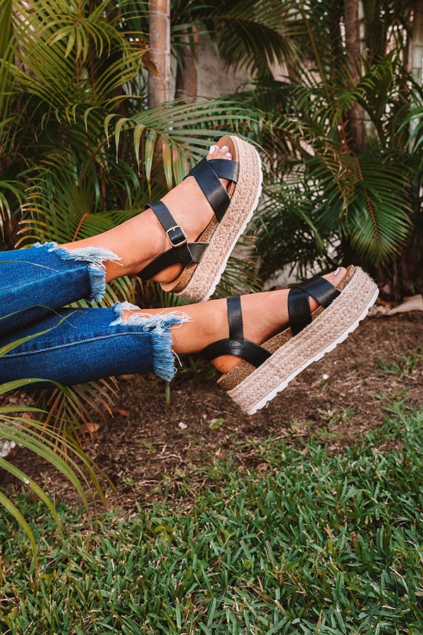 Step into summer in style with these adorable espadrilles featuring black faux leather material, two crossed over-the-foot straps, rounded open toes, a buckled ankle straps, flat 2-inch platform soles, and a lightweight silhouette! These espadrilles run more true to size.