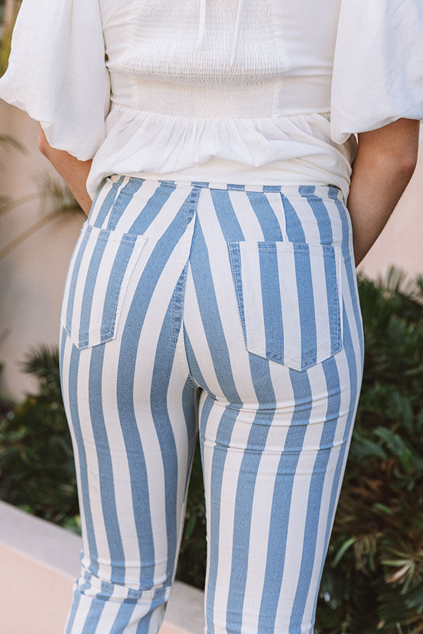 Our adorable "Jojo" flare features a midrise waist fit, blue and white vertical accent stripes, a great stretchy fitted feel, and oversized wide frayed hems! Plus, they have a 4 pocket cut with belt loops and a hidden zip fly with a button closure! This retro piece can be styled with your best basic tank and flat espadrilles in warmer weather or with your favorite long sleeve blouse and best close toed wedges for those colder days!