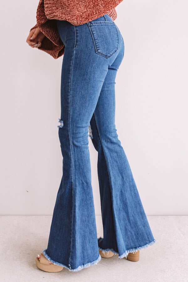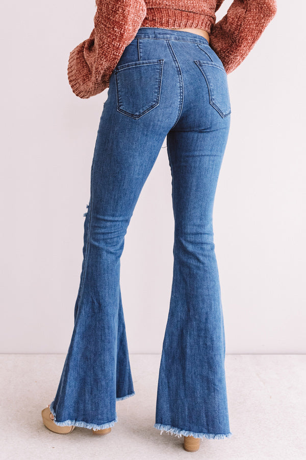 You are sure to love "The Jonas" bottoms featuring medium wash denim, a high waistline, distressed detailing, four pocket cuts, belt loops, a hidden zip with a button closure, and a stretchy figure flattering fit that leads into a trendy and oversized flared raw hem cut! These trendy bottoms will take you from season to season when you wear with your favorite open toed heel and tank top in the summer and with booties and a sweater in the fall!