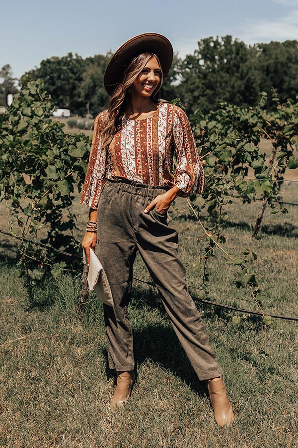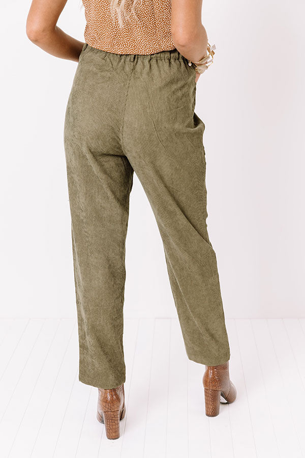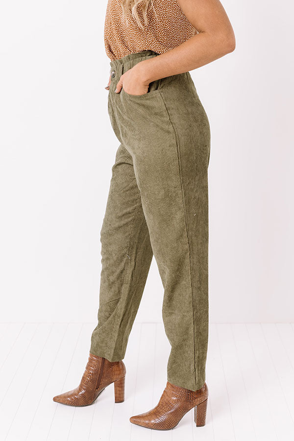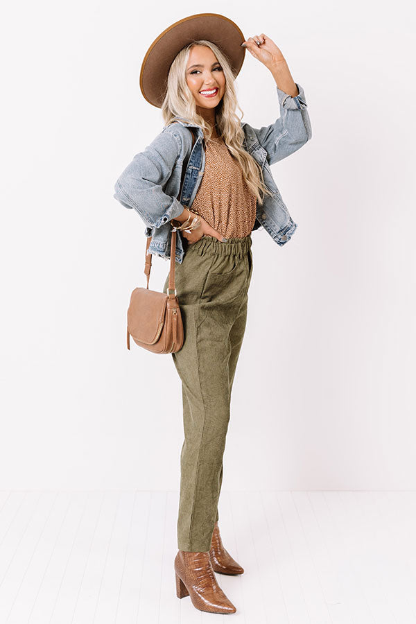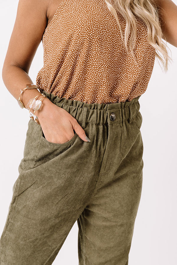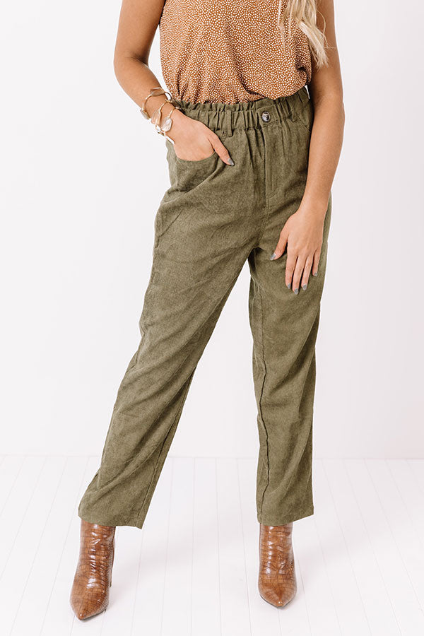 Strut down the street in style with our gorgeous olive colored 'Juni' pant featuring lightweight material with ultra tiny vertical ribbed detailing, a high bunched waistline with ruffled trim and belt loops, a button closure, accent side pockets, and a relaxed straight-leg silhouette that falls into straight ankle-length hemlines! Measurements