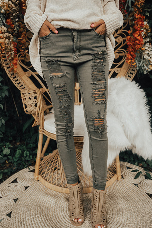 These olive distressed skinny jeans have a flattering high waisted fit, a great stretchy fitted feel, an ultra distressed skinny pant leg & an ankle length hem.