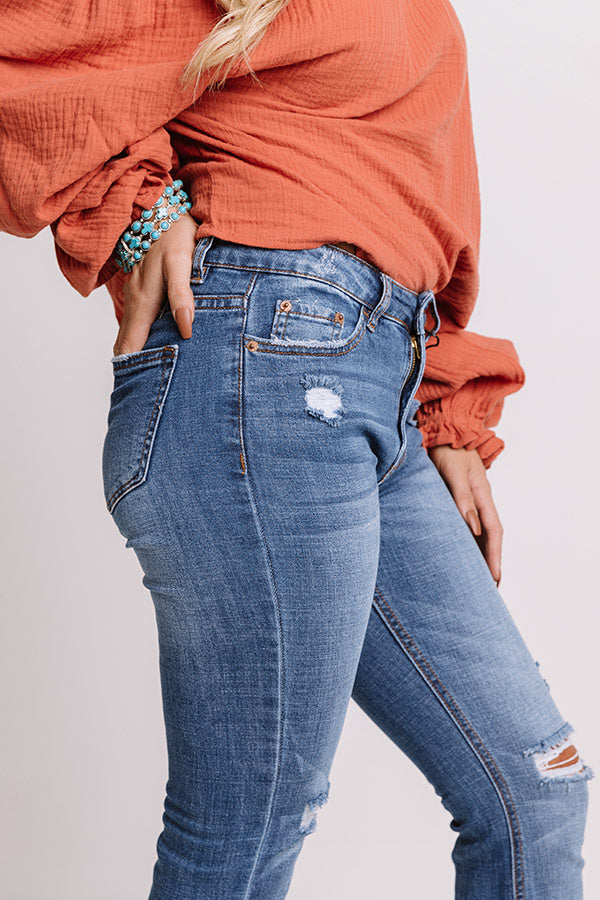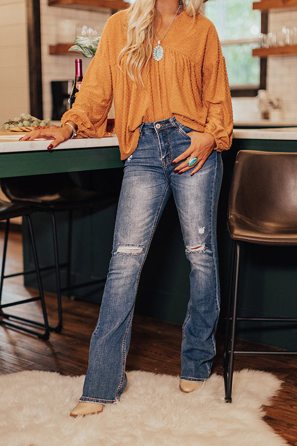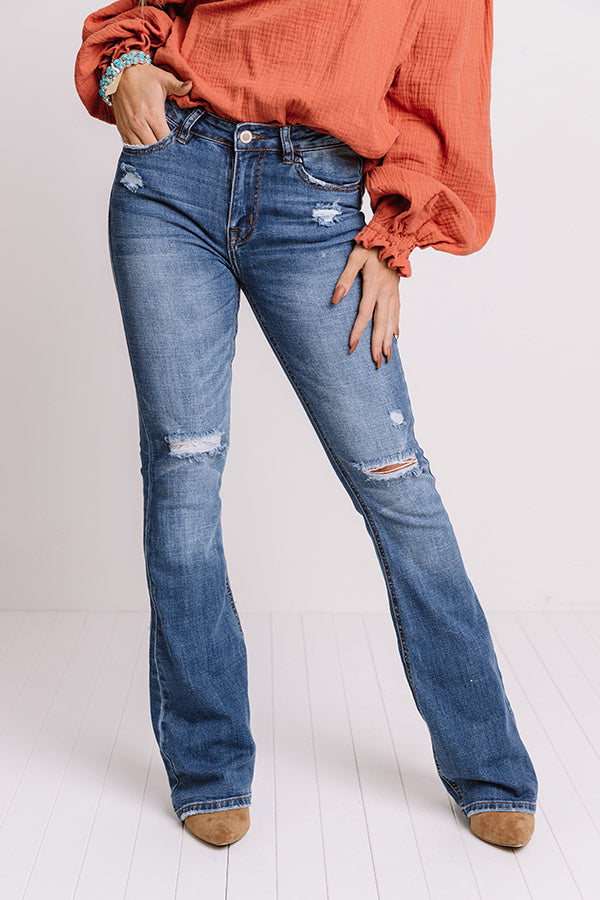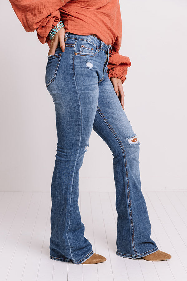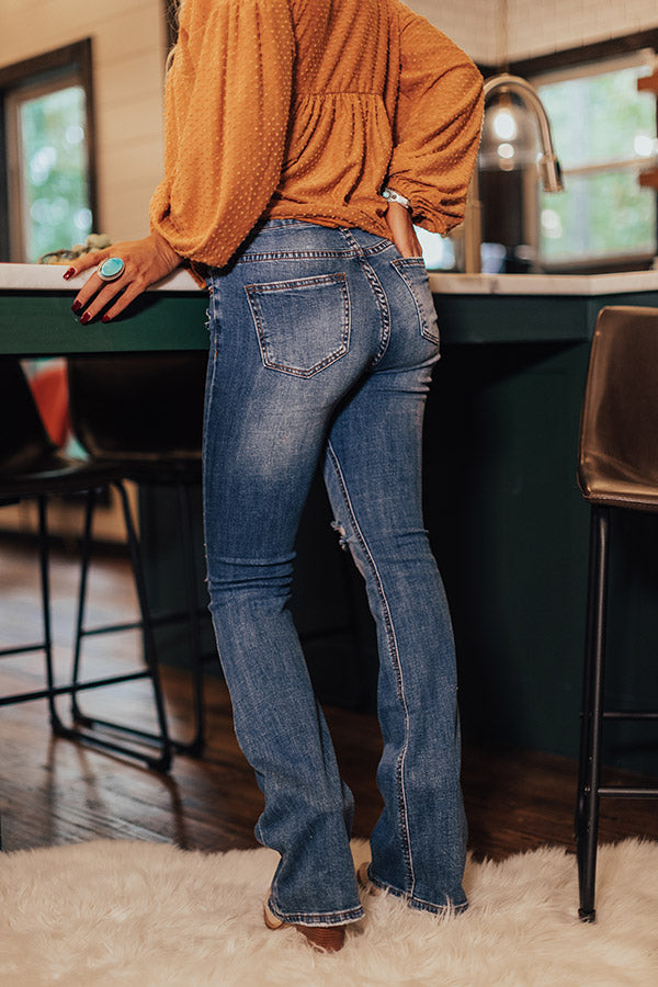 You are sure to love "The Kelson" flares featuring lightweight dark wash denim material with subtle accent fading and distressed detailing, a high waist silhouette with belt loops, a hidden zip fly with a button closure, four pocket cuts, and a stretchy figure flattering fit that falls into trendy raw cut floor-length hemlines! Measurements