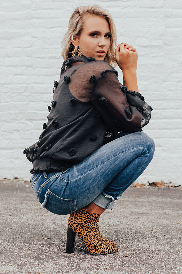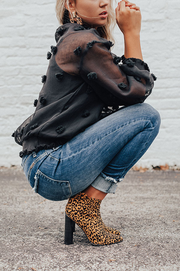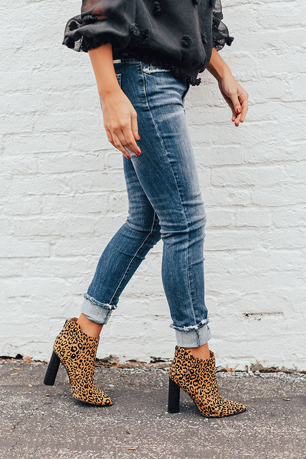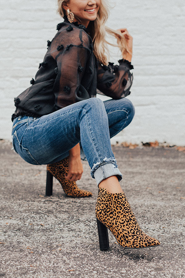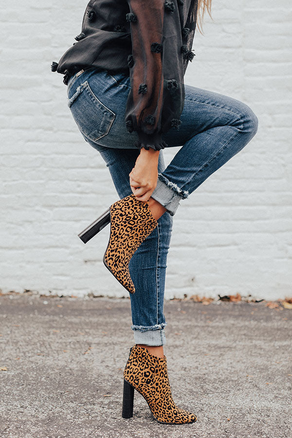 Strike a pose this fall in our adorable "Kendra" bootie featuring sleek faux leather material, a brown and black leopard print pattern and texture, 4.5-inch black block heels, a pointed closed toe, an above the ankle fit, and inside zippers! This bootie runs more true to size.