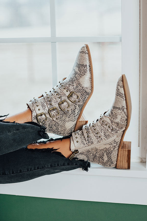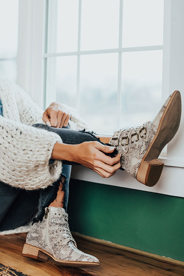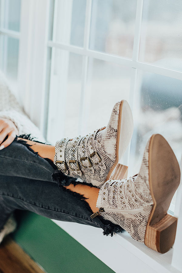 Step into winter in style with "The Kissinger" bootie featuring sleek faux leather material patterned with a black and neutral hued snake print, four over-the-foot straps with buckle hardware and studded detailing, pointed closed toes, a short block heel, inside zippers, and an ankle height silhouette!