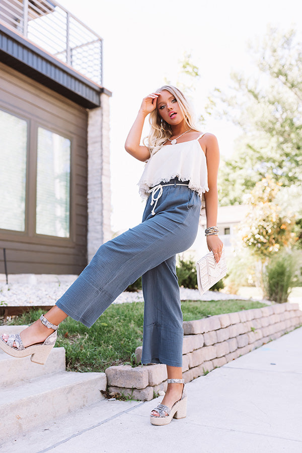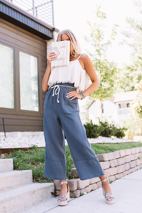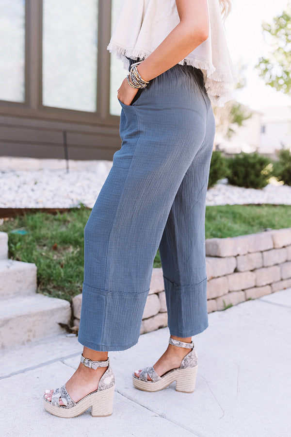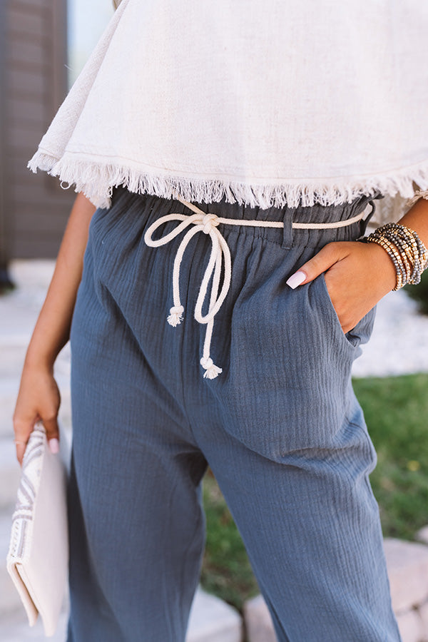 Make the world your runway in our sleek slate colored "Lachlan" pants featuring lightweight material with subtle texturing, a high elastic waistline with belt loops and a tie belt, accent side pockets, and an ultra relaxed silhouette that falls into straight raw-cut ankle-length hemlines! We have styled these cuties with a neutral bodysuit, snake print block heels, and an embellished clutch, but you can also wear it with our "Theme Song Shift Tee in Pink," sunnies, and "The Mara Sandal in Pink!" Measurements
