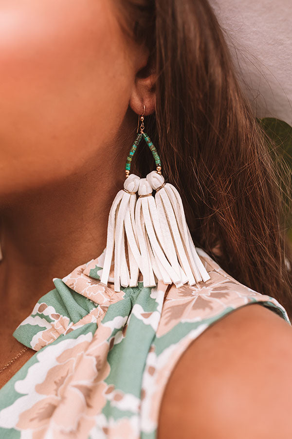 The 4.75-inch "Laguna" earrings feature 14kt gold fill wire and white hand cut North American genuine leather tassels and African turquoise stones!