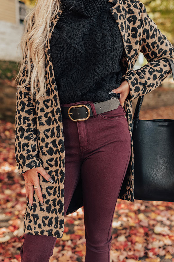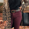 You will look like you have "the latest in luxury" when you accessorize with this statement belt featuring a wide black band with a bronze circle buckle!