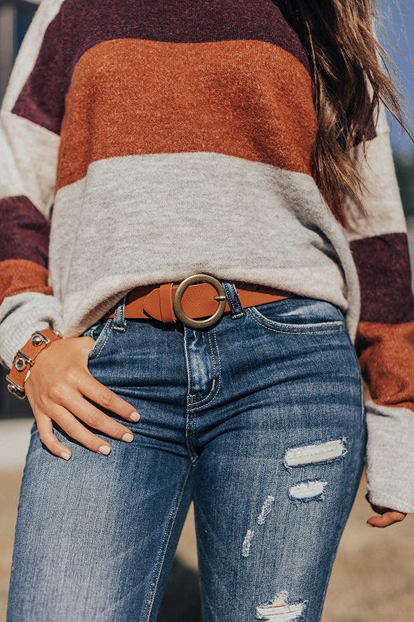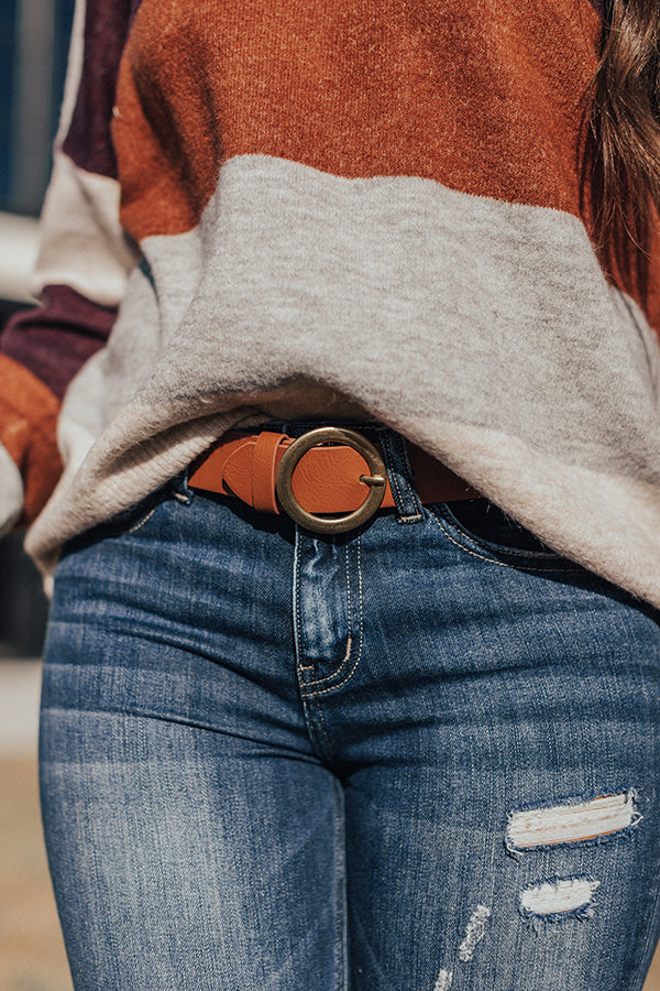 You will look like you have "the latest in luxury" when you accessorize with this statement belt featuring a wide maple colored band with a bronze circle buckle!