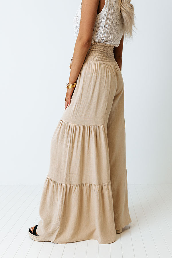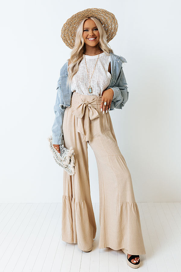 People are sure to be fascinated with your OOTD when you complete your look with these adorable light beige colored pants featuring lightweight breezy material, a high smocked waistline with a large tie belt, and an ultra relaxed tiered silhouette that falls into floor-length bell bottom hemlines! on products