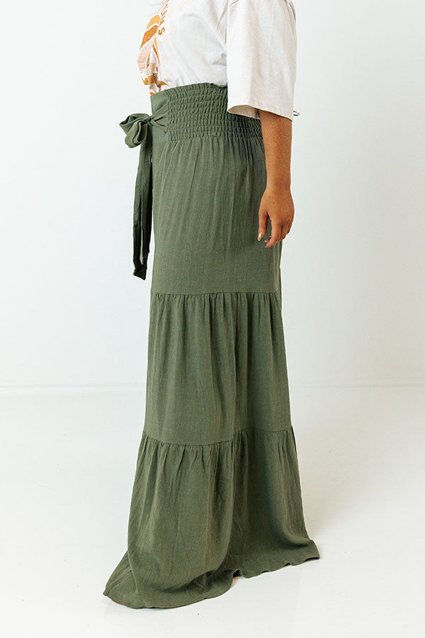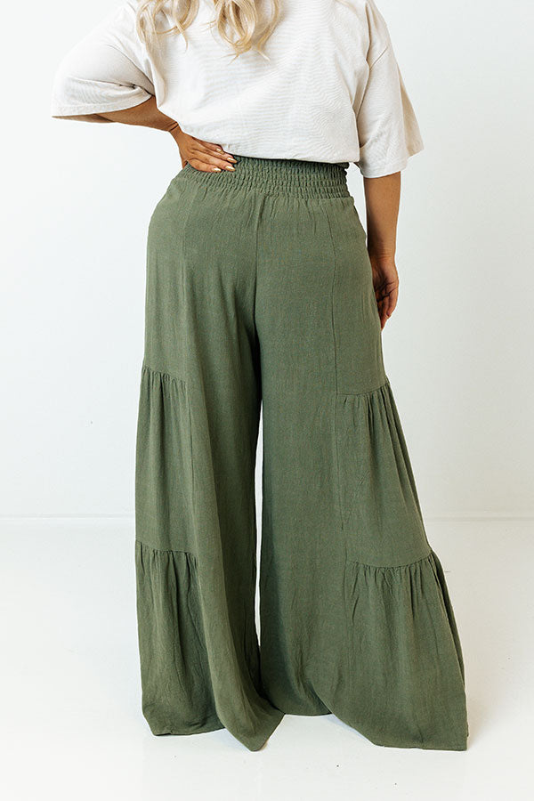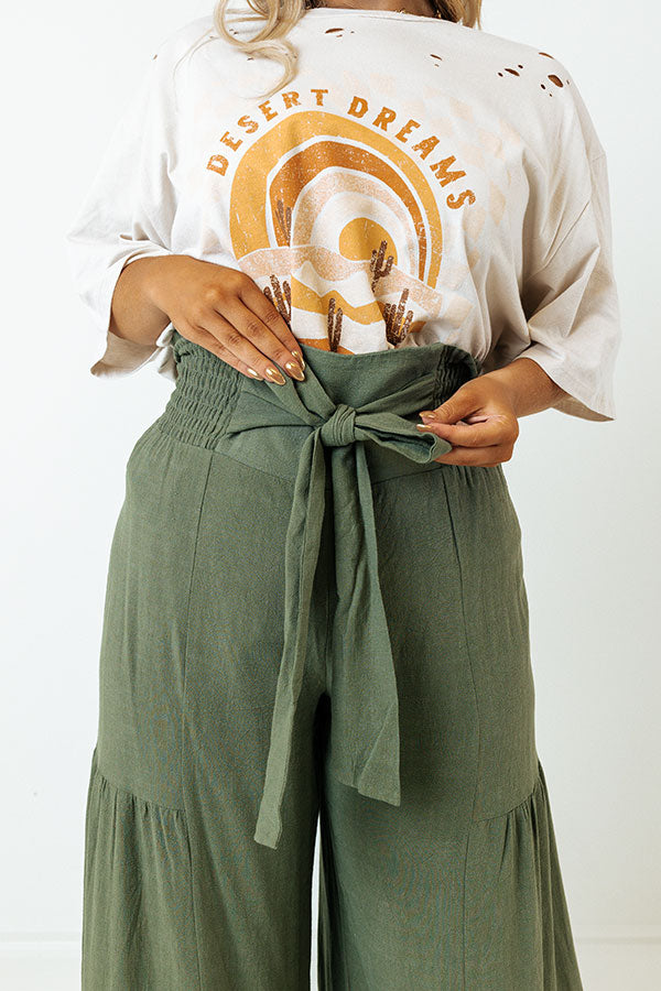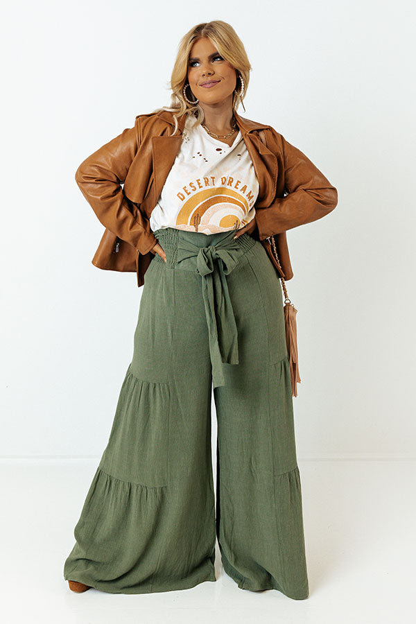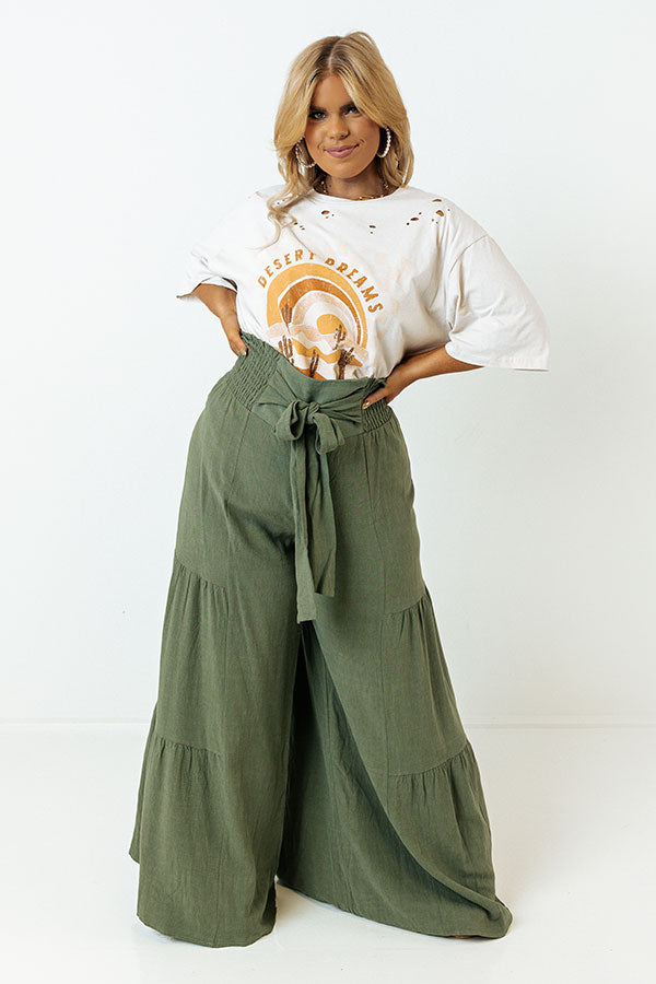People are sure to be fascinated with your OOTD when you complete your look with these adorable olive colored pants featuring lightweight breezy material, a high smocked waistline with a large tie belt, and an ultra relaxed tiered silhouette that falls into floor-length bell bottom hemlines!