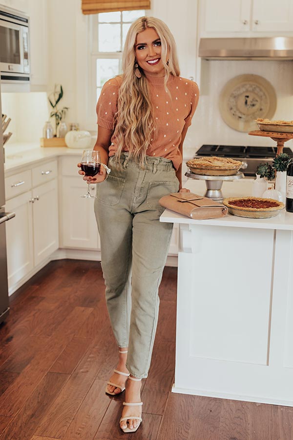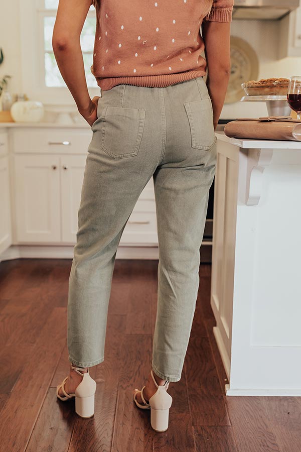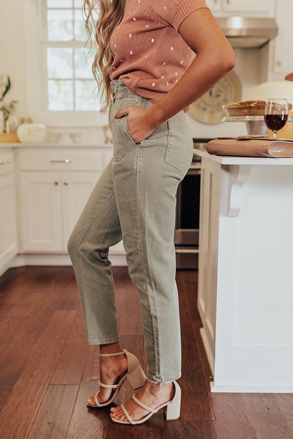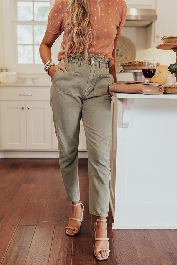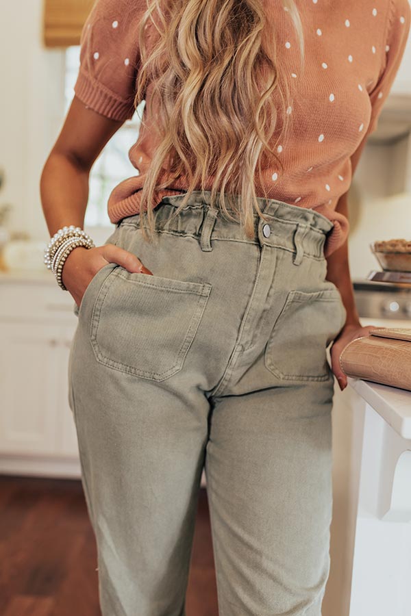 Add a unique twist to the mom jean trend with our gorgeous sage colored "Levy" pants featuring lightweight denim like material, a high waistline with belt loops and bunched ruffle trim detailing, a zip fly with a button closure, two front pockets, two side pockets, and two back pockets, and a relaxed tapered silhouette that falls into straight ankle-length hemlines that can be cuffed!