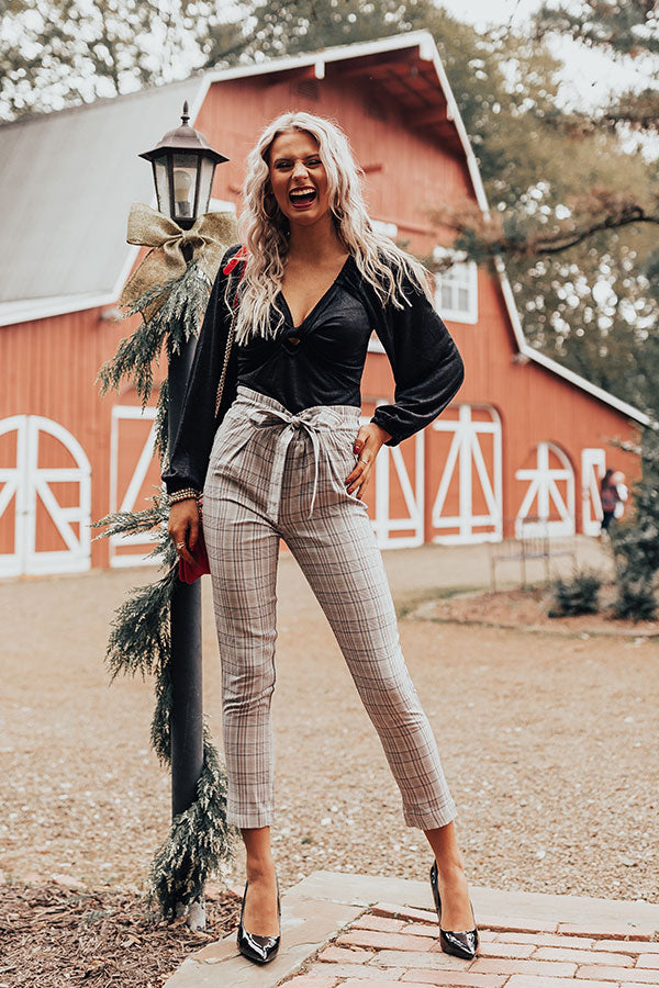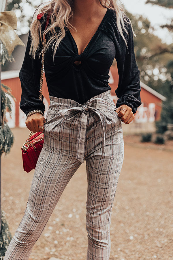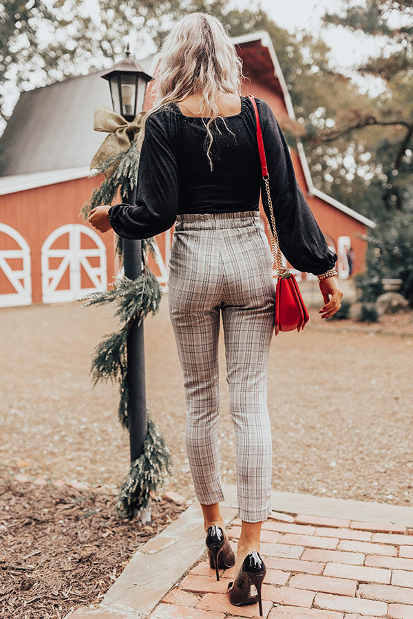 Arrive in style in our chic grey 'Linford' pants featuring lightweight material patterned with a think black plaid print, an elastic waistline with a tie closure, hidden side pockets, and a flattering figure hugging silhouette that ends in straight ankle-length hemlines! Measurements