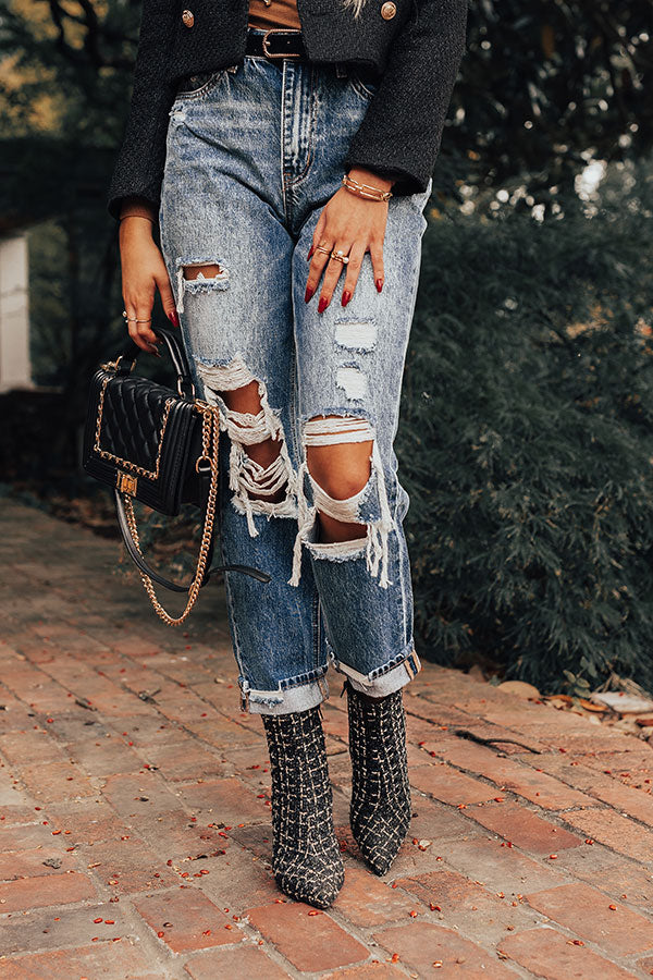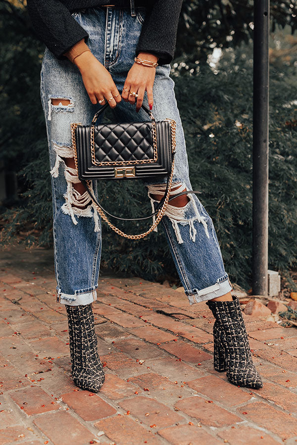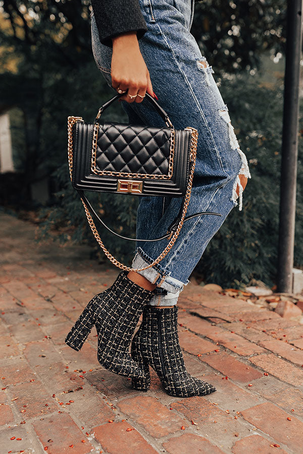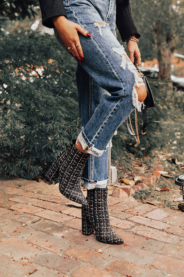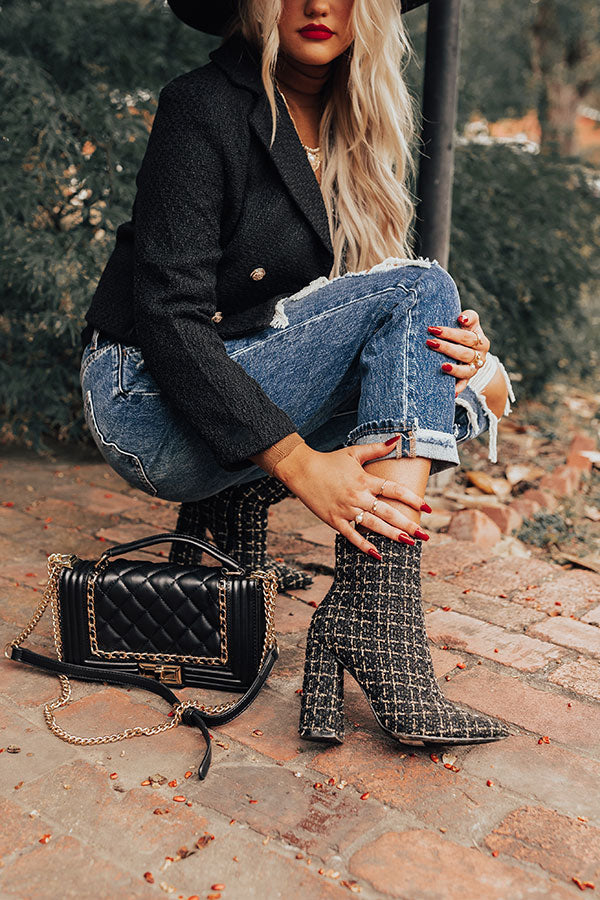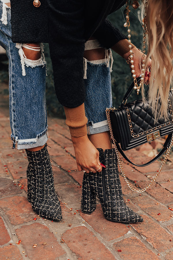 Step up your holiday shoe game with our luxe black 'Lisha' bootie featuring gold tweed material, pointed closed toes, a 4.5-inch block heel, an inside ankle-zip closure, and a flattering ankle-high silhouette! For a more comfortable fit, we recommend ordering a 1/2 size up from what you typically wear. For example, if you normally wear a size 7, we recommend ordering a size 7.5.