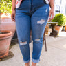 This medium-wash distressed skinny jean has a mid-rise fit, a great stretchy feel & a skinny pant leg with a little wiggle room at the hem.