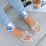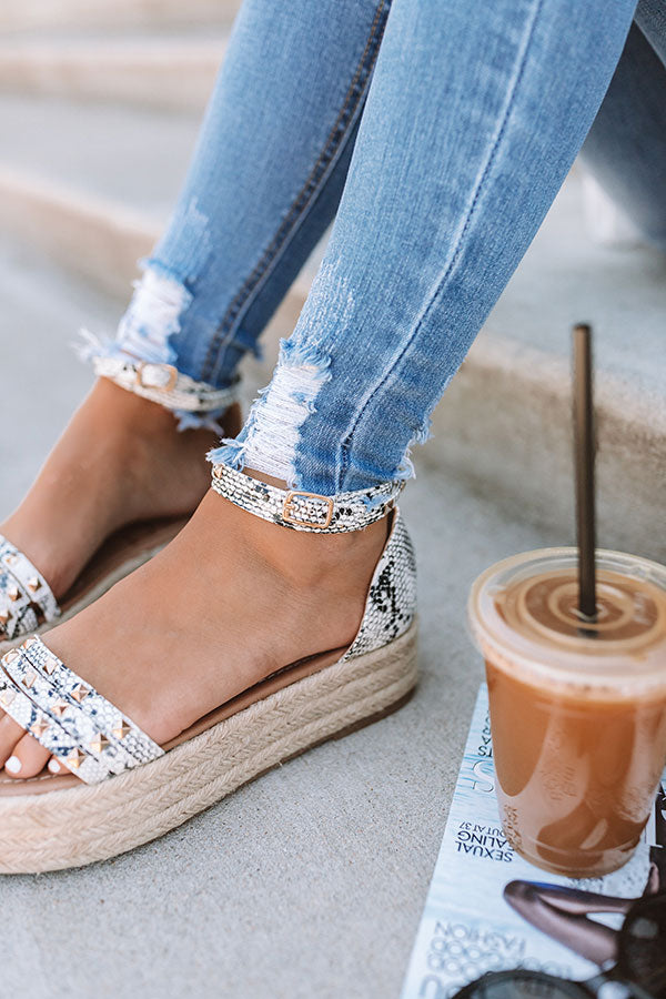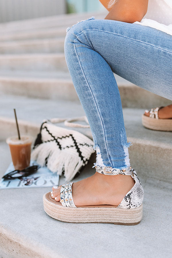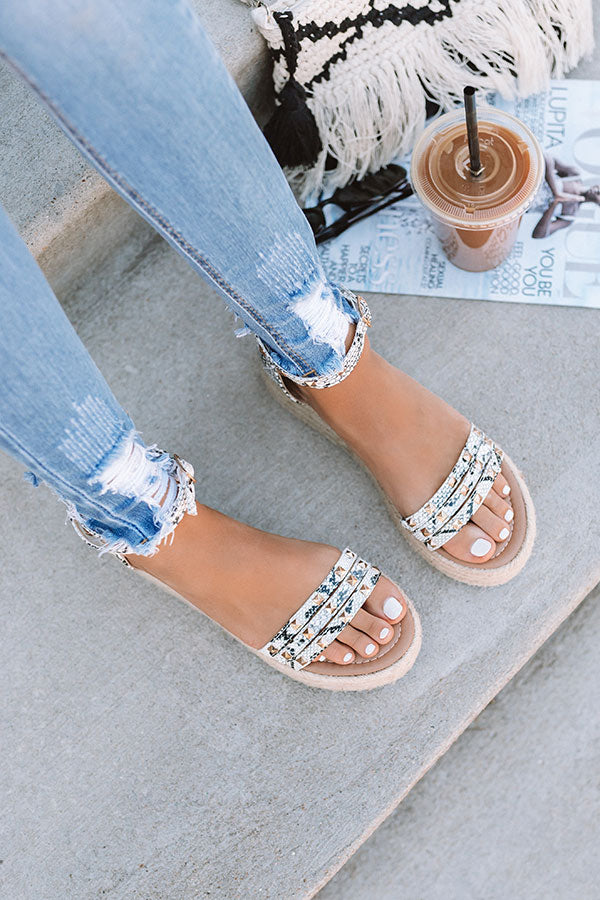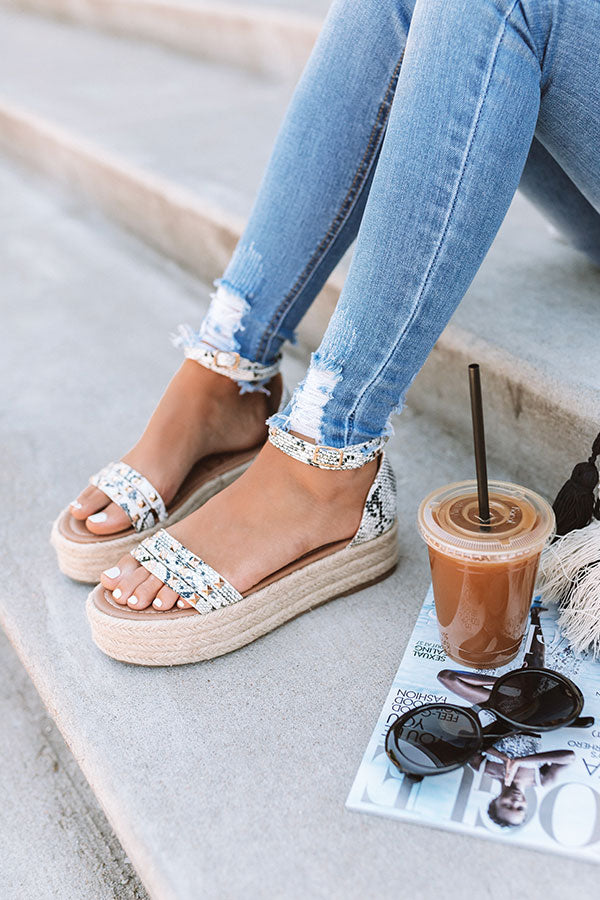 Happiness is...receiving the shoes you ordered online! So add these snake print espadrilles to your cart with their three foot straps, lifted textured sole, and closed heel with a buckled strap!