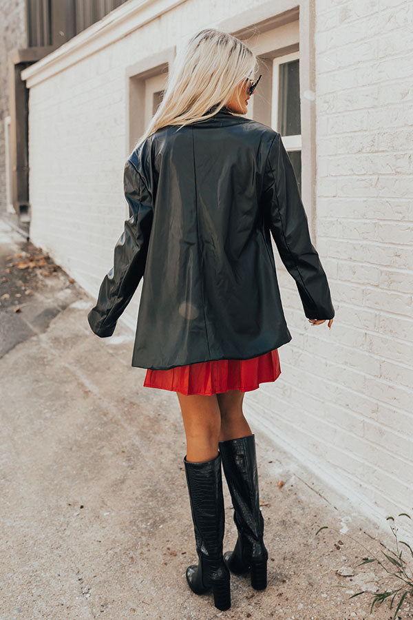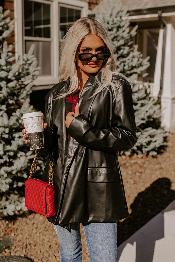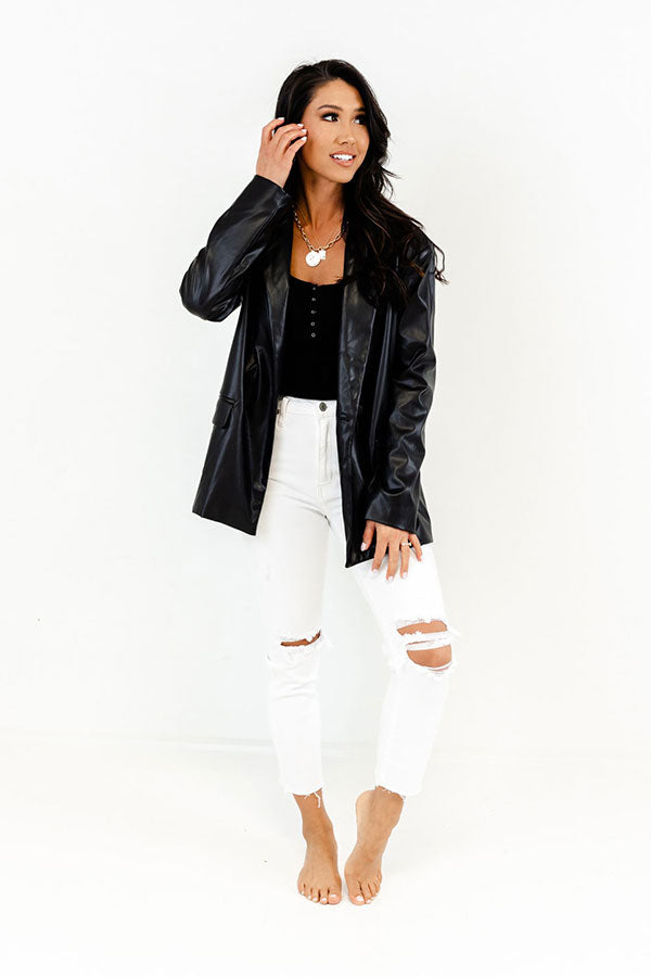 Give your outfit a chic vibe with 'The Luella' faux leather jacket! Features sleek black faux leather, collar, long straight sleeves, single button closure, two functional side pockets with flap closure, and a loose fit that falls into a straight hemline.