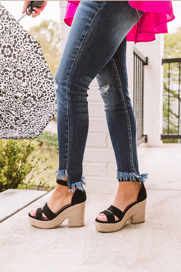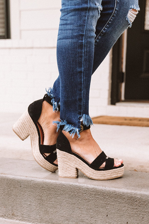 Our versatile black "Lula Heel" features a 3.5-inch block heel and a lifted textured sole with jute texturing, two 1-inch over-the-foot straps, rounded open toes, and closed heels with a buckled ankle straps!