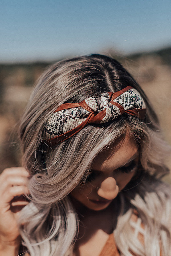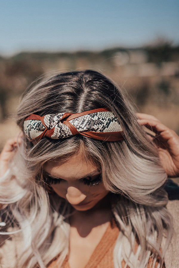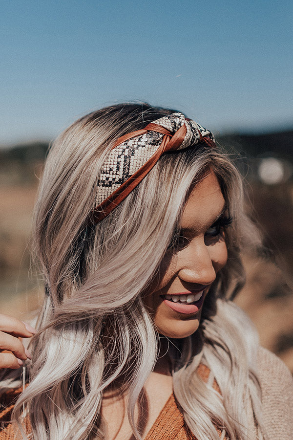 Top off your outfit of the day in the most stylish way with our cinnamon colored "Lulu" headband featuring a black and white snake print pattern, an open structured headband and an accent top knot!