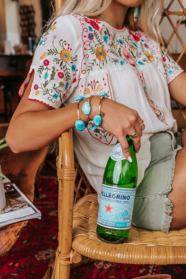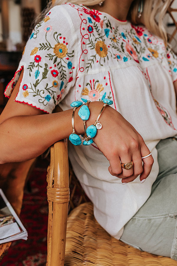 The 'Luma' bracelet features a gold plated copper wire-wrapped bangle adorned with three turquoise tones! Stones may vary in size, shape or color. Each bangle sold separately.