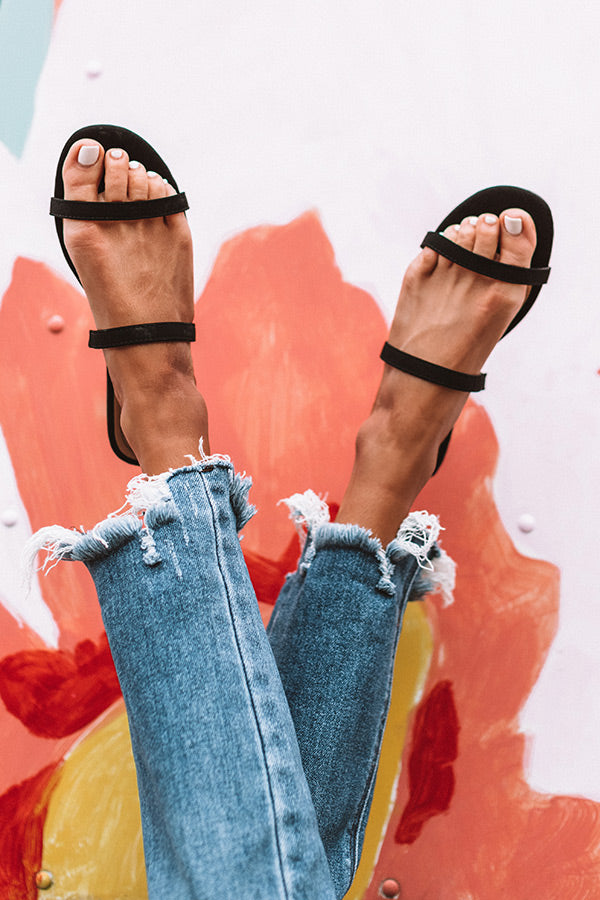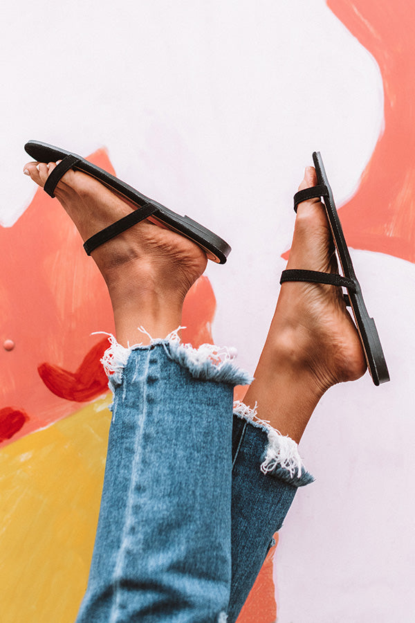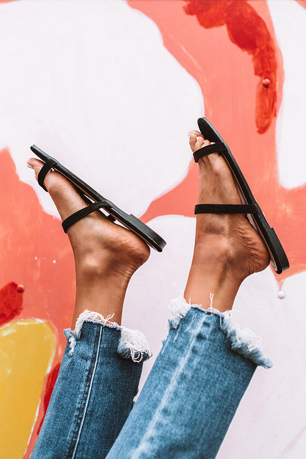 Slide into summer in style with our adorable black "Lyla Sandal" featuring two thin over-the-foot straps, rounded toes, flat soles, and a slip on silhouette with open heels!
