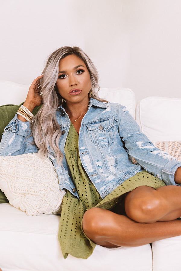 Your seasonal outfits will be envied when you complete your look with "The Lynndon" denim jacket featuring lightweight light wash material, ultra distressed detailing, a button down front with a collared neckline, two accent chest pockets with flap closures, long loose sleeves button closure cuffs that can be rolled, and a relaxed silhouette that falls into a straight hemline! You can wear this trendy piece with a camisole or summer dress underneath or you can put it over a fall blouse to add some edginess to your pristine transitional style!