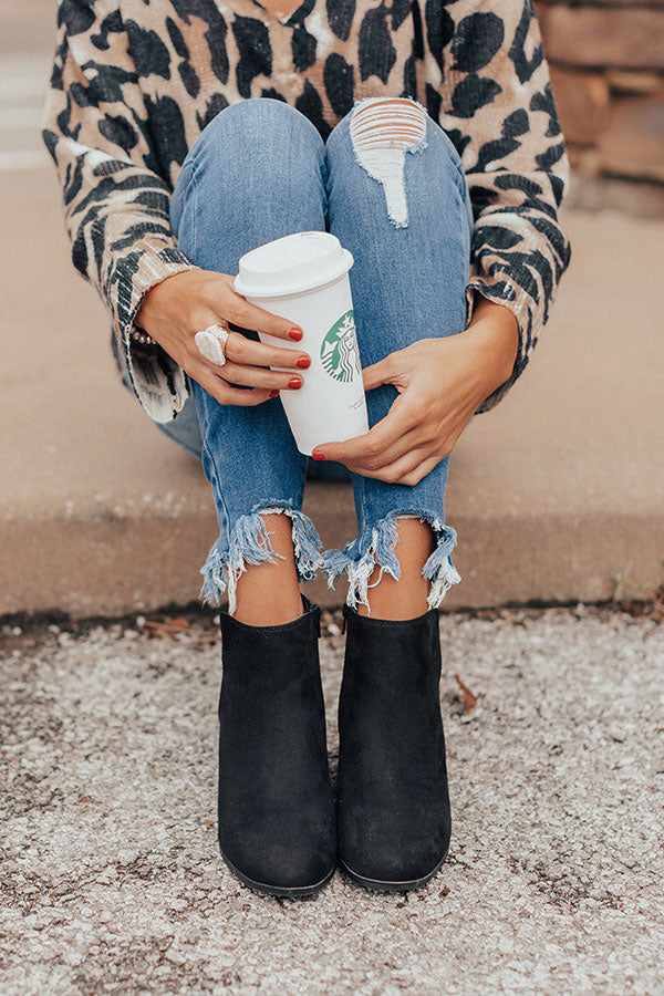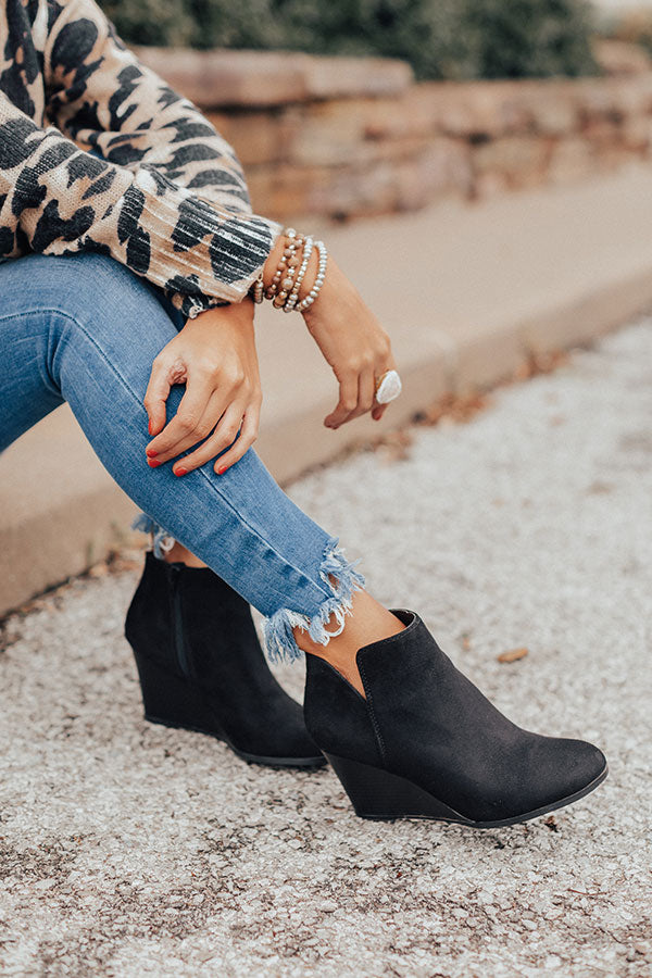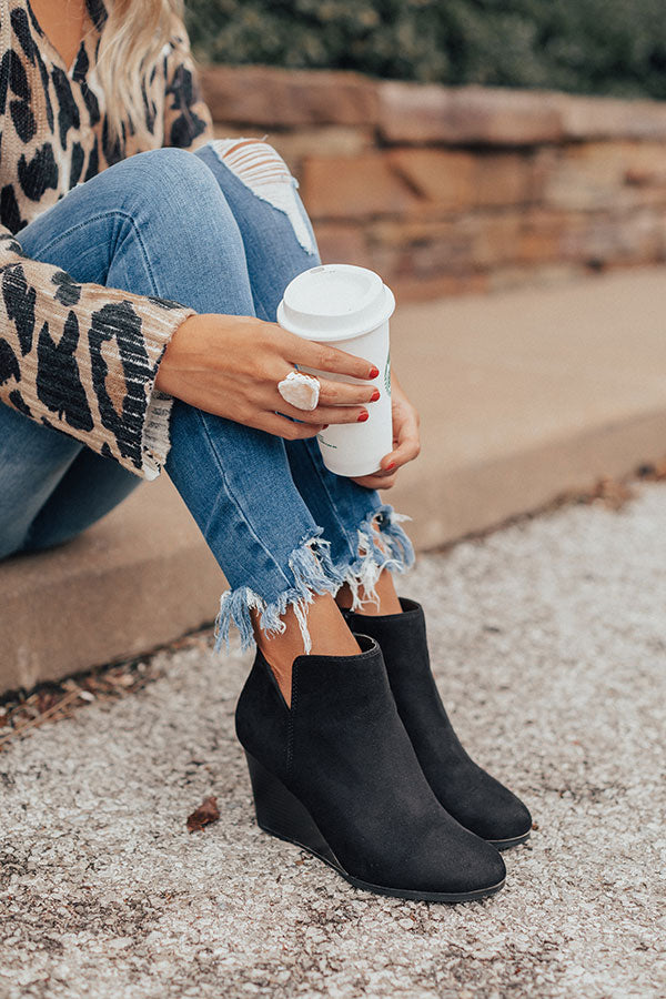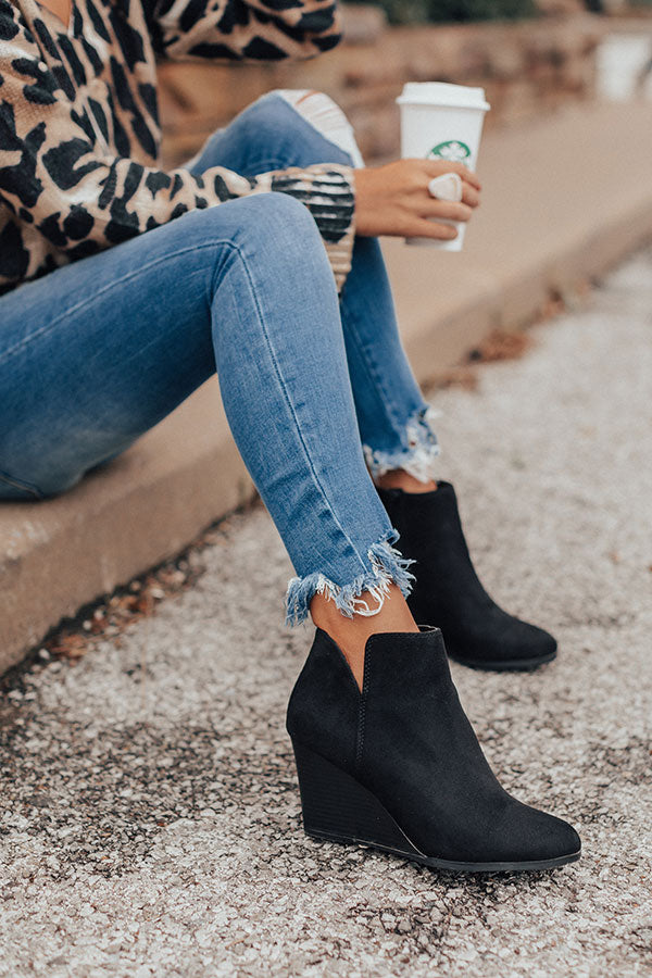 Keep your fall shoe style functional but fashionable in "The Macon" black bootie featuring a faux suede material, ankle notches, rounded closed toes, 3-inch wedged heels, and inside zippers!