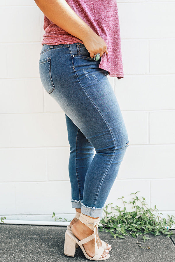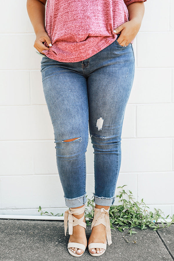 These medium wash denim skinny jeans have a mid-rise fit, a great stretchy fitted feel, a skinny pant leg with subtle distressing & slit knees & a frayed ankle length hem.